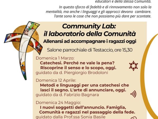 Dal 1 marzo al 24 maggio si terranno 5 incontri dedicati a “Annunciare correttamente il Vangelo”. Community Lab: il laboratorio della Comunità Allenarsi ad accompagnare i ragazzi oggi, domenica… Read More
