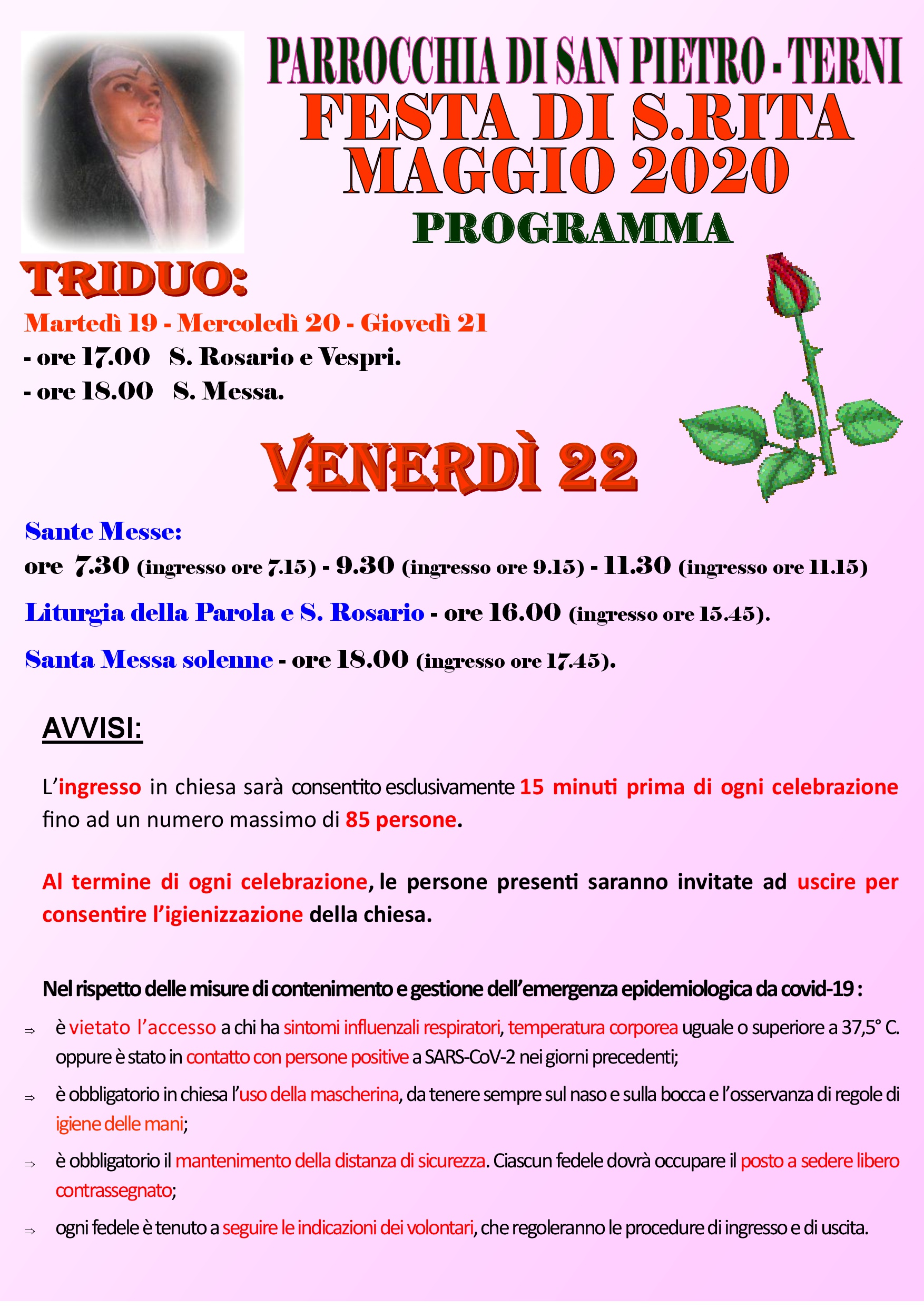 In ottemperanza alle disposizioni in vigore dal 18 maggio, che vietano assembramenti e impongono il distanziamento delle persone, NON sarà effettuata la tradizionale distribuzione delle rose benedette fuori dalla chiesa.