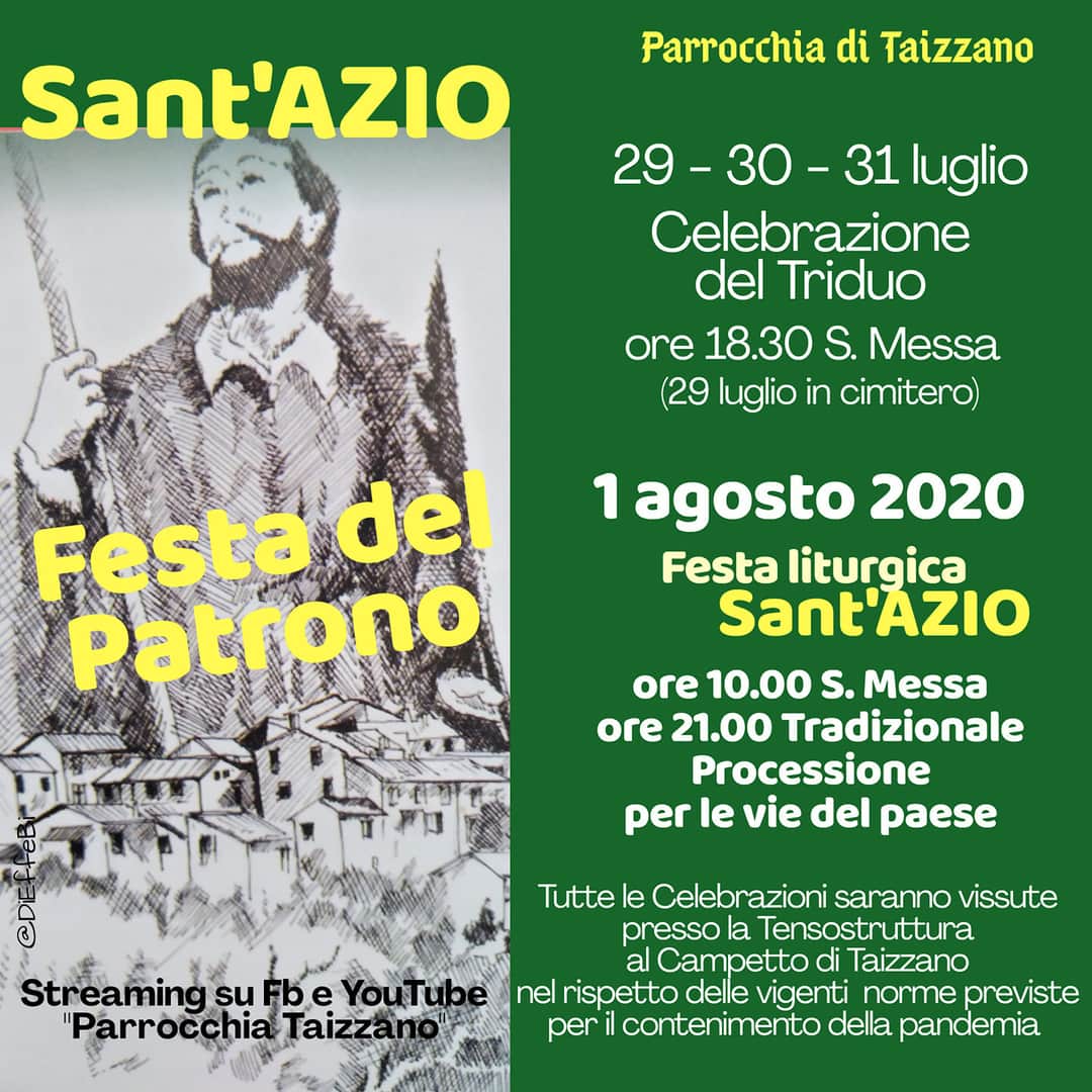 Il 1 agosto festa di Sant’Azio alle ore 10.00 si terrà la solenne celebrazione presso la tensostruttura al campetto di Taizzano e alle ore 21 la solenne processione con il simulacro del Santo.