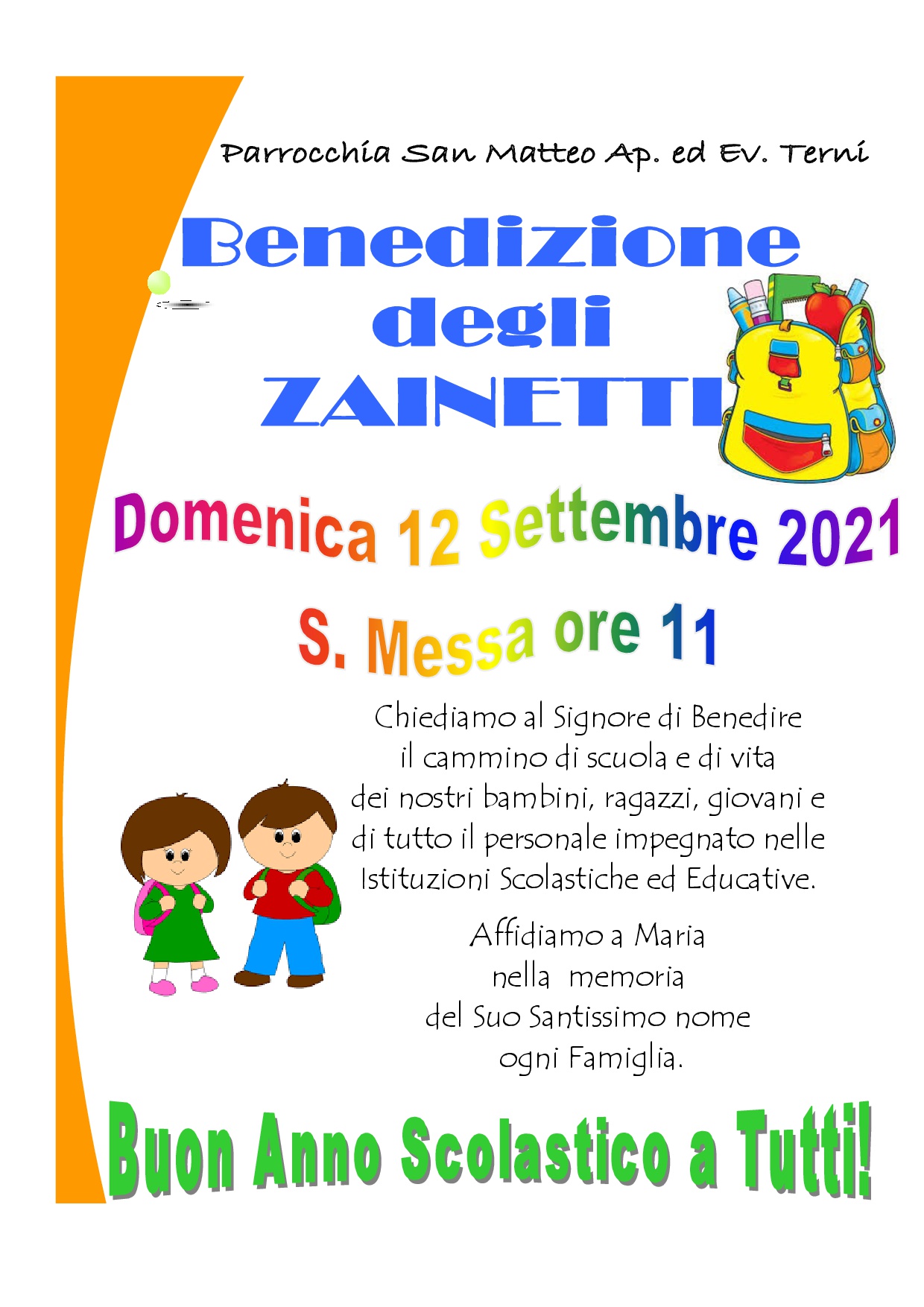 Domenica 12 settembre alla messa delle ore 11 saranno benedetti gli zainetti e gli studenti come segno di vicinanza a ragazzi e famiglie nel momento di riapertura della Scuola. Una benedizione per prossimo cammino di scuola e di vita dei bambini e ragazzi e di tutte le persone impegnate nelle istituzioni scolastiche ed educative.