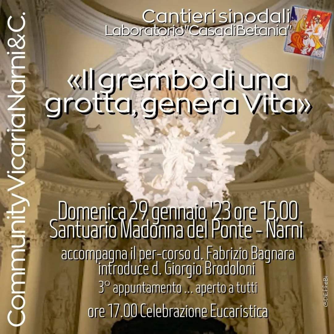 Domenica 29 gennaio alle ore 15 al Santuario della Madonna del Ponte di Narni scalo si terrà il terzo incontro dei cantieri Sinodali della Vicaria di Narni. “Il grembo di una grotta, genera Vita” è il tema del laboratorio “casa di Betania” che sarà guidato da don Frabrizio Bagnara e introdotto da mons. Piergiorgio Brodoloni. Alle ore 17 si concluderà con la celebrazione eucaristica.
