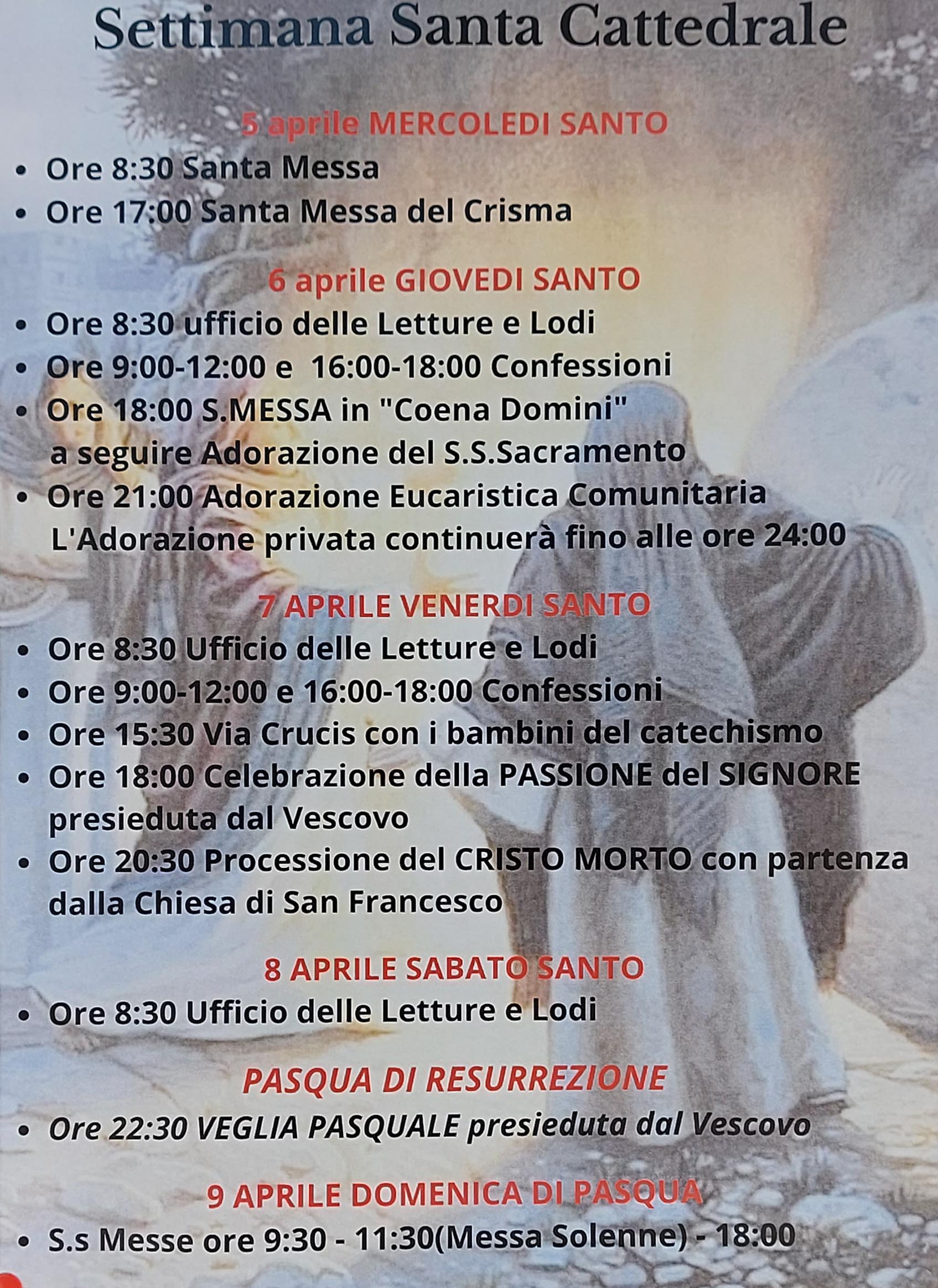 – venerdì 7 aprile alle ore 18 il vescovo presiederà la celebrazione della Passione del Signore e l’atto di adorazione della Croce. Alle ore 20.30 la processione del Cristo morto lungo le vie del centro cittadino dalla chiesa di san Francesco alla Cattedrale che, con preghiere, meditazioni e canti ripercorre le sofferenze di Cristo in croce, che sono anche quelle di ogni persona bisognosa d’aiuto, le croci di chi soffre per i tanti mali che affliggono il mondo contemporaneo.