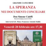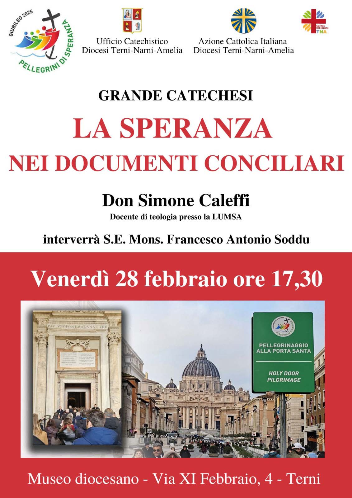 Venerdì 28 febbraio alle ore 17.30 presso il Museo Diocesano di Terni si terrà la catechesi “La speranza nei documenti conciliari” promossa dall’Azione Cattolica diocesana nell’ambito delle manifestazioni diocesane per la festa di San Valentino “Pellegrini di speranza con San Valentino”. Interverrà don Simone Caleffi, presbitero della Diocesi di Roma, dottore in teologia morale, è docente all’Istituto di Scienze Religiose “Ecclesia Mater” e alla LUMSA, autore di diverse pubblicazioni ed editorialista sull’Osservatore Romano.