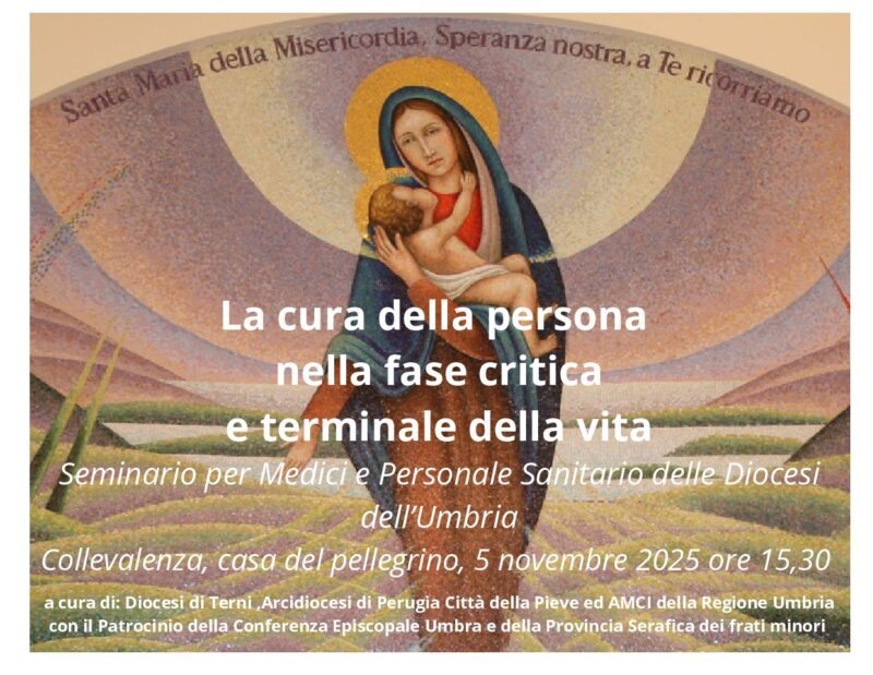 Mercoledì 5 novembre 2025 alle ore 15,30 a Collevalenza si terrà il seminario “La cura della persona nella fase critica” rivolto ai medici e personale sanitario delle diocesi dell’Umbria, promosso dalla Diocesi di Terni-Narni-Amelia, dall’Arcidiocesi di Perugia-Città della Pieve ed AMCI della Regione Umbria con il Patrocinio della Conferenza Episcopale Umbra e della Provincia Serafica dei frati minori.