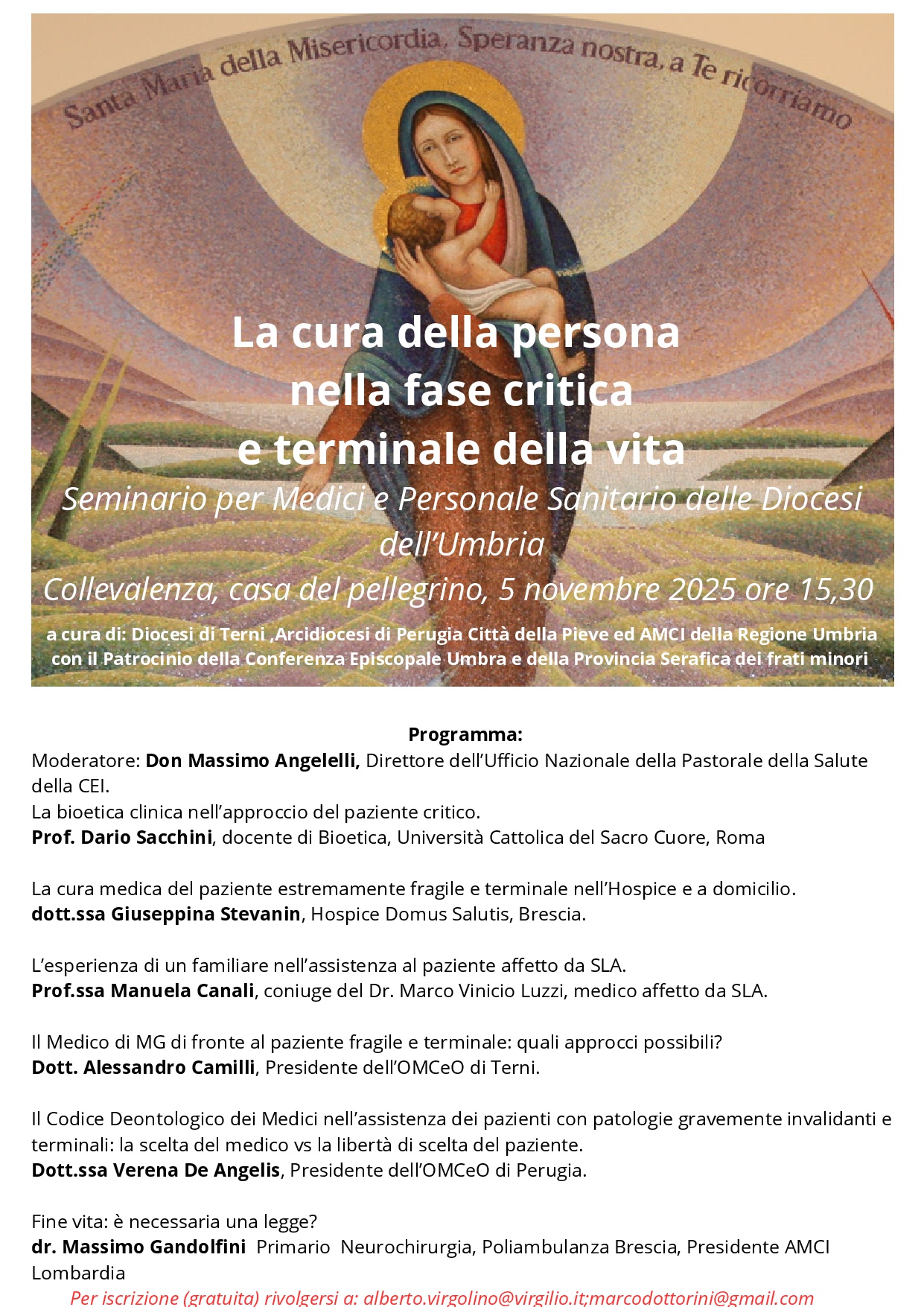 Mercoledì 5 novembre 2025 alle ore 15,30 a Collevalenza si terrà il seminario “La cura della persona nella fase critica” rivolto ai medici e personale sanitario delle diocesi dell’Umbria, promosso dalla Diocesi di Terni-Narni-Amelia, dall’Arcidiocesi di Perugia-Città della Pieve ed AMCI della Regione Umbria con il Patrocinio della Conferenza Episcopale Umbra e della Provincia Serafica dei frati minori.