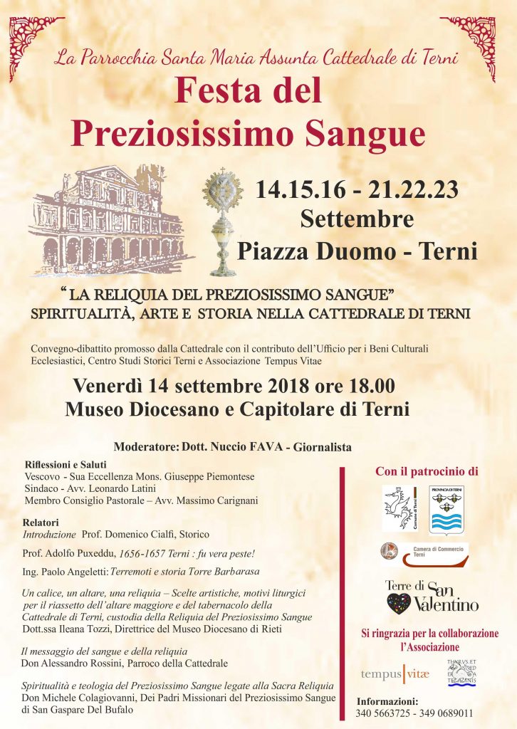 “La reliquia del Preziosissimo Sangue – Spiritualità, arte e storia, nella Cattedrale di Terni” è il convegno promosso dalla Cattedrale con il contributo dell’Ufficio per i Beni Culturali Ecclesiastici, Centro Studi Storici Terni e Associazione Tempus Vitae che si terrà venerdì 14 settembre 2018 ore 18.00 al Museo Diocesano e Capitolare di Terni