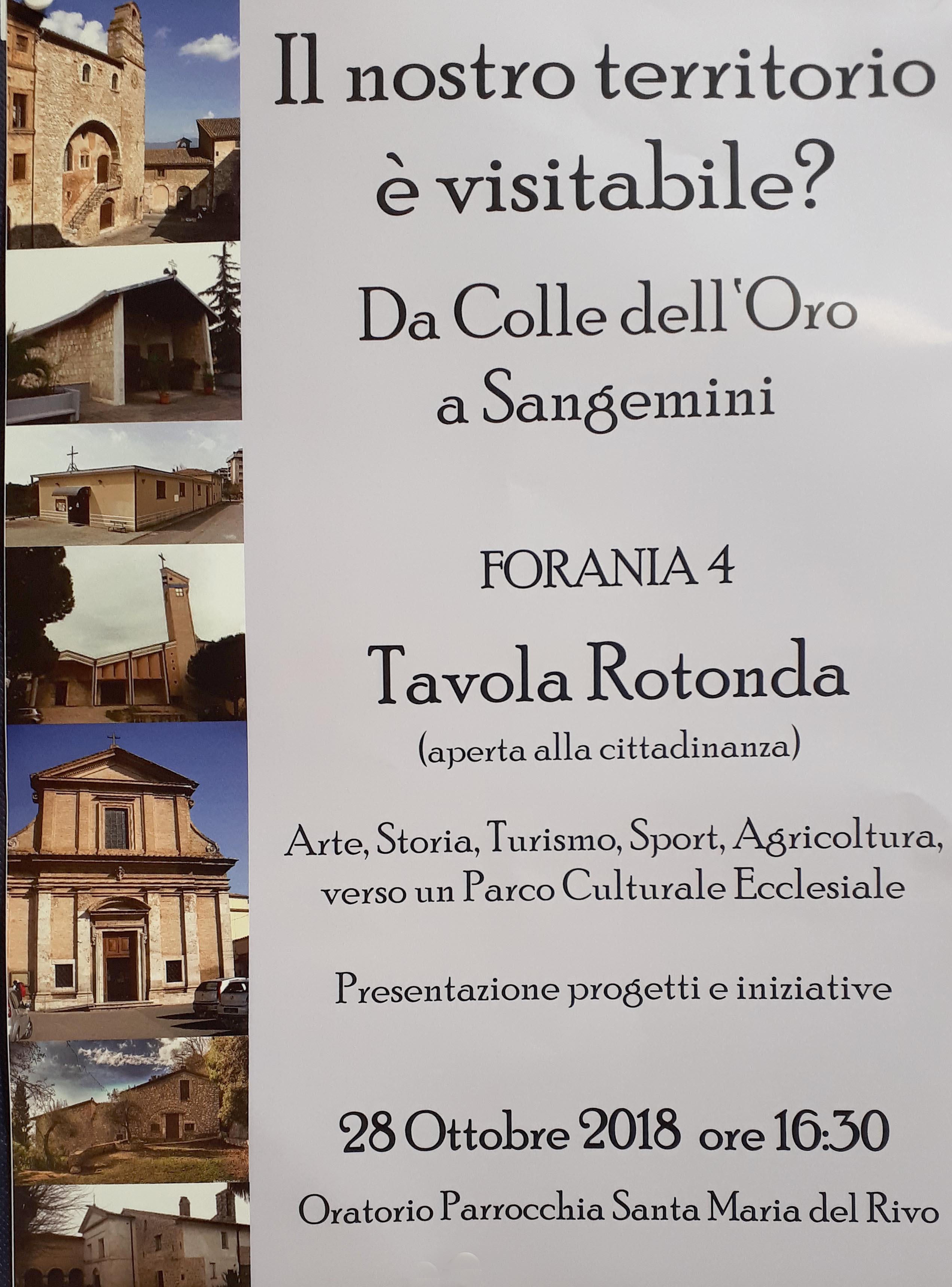 “Il nostro territorio è visitabile? Da Colle dell’Oro a Sangemini” è l’incontro che si terrà il 28 ottobre 2018 alle ore 16:30 presso l’oratorio della parrocchia di Santa Maria del Rivo, promosso dalla Forania Terni 4, aperta alla cittadinanza che tratterà di Arte, Storia, Turismo, Sport, Agricoltura, verso un Parco Culturale Ecclesiale e la presentazione di progetti e iniziative.