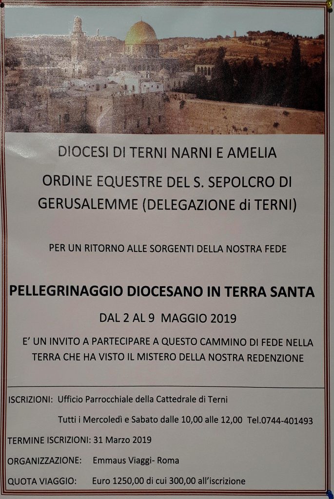 Dal 2 al 9 maggio pellegrinaggio diocesano in Terra Santa promosso dalla diocesi e dalla delegazione di Terni dell’Ordine equestre del santo Sepolcro, per un ritorno alle sorgenti della fede.
