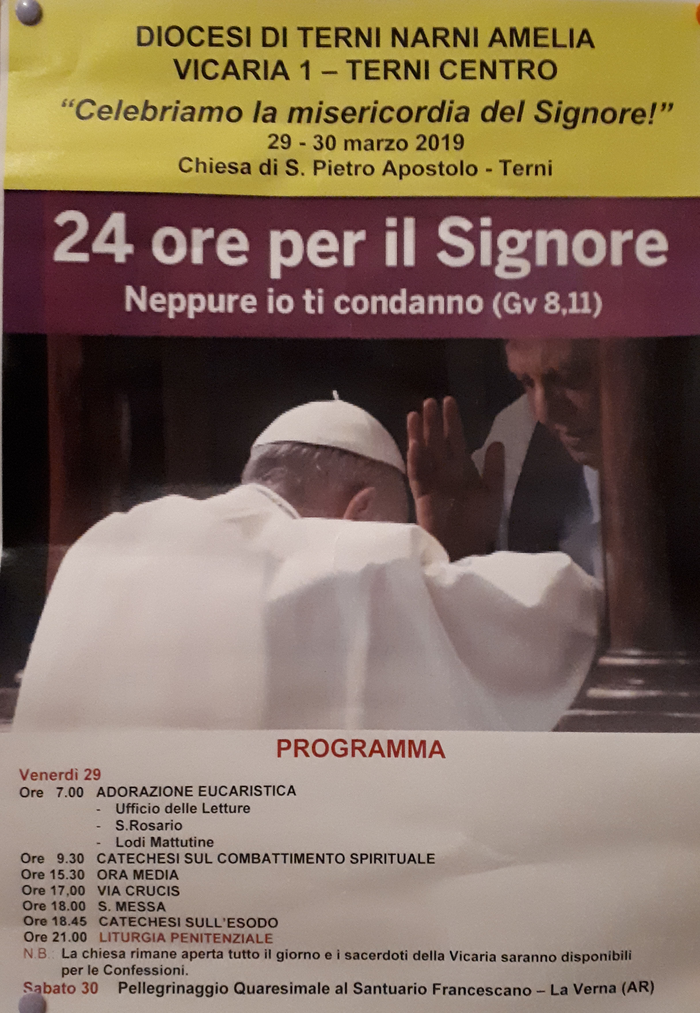 Dal 29 al 30 marzo nella chiesa di San Pietro a Terni si terrà la preghiera delle “24 ore per il Signore” con tutte le comunità della vicaria Terni 1. Si comincerà il 29 marzo alle ore 7 con l’adorazione eucaristica, catechesi, ora media, via crucis, santa messa e liturgia penitenziale alle ore 21.