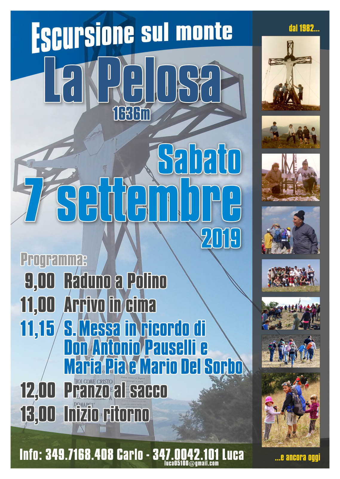 Tradizionale escursione sul Monte La Pelosa sabato 7 settembre 2019, organizzata in memoria di don Antonio Pauselli e dei coniugi Maria Pia e Mario Del Sorbo: persone legate da una forte amicizia e dalla passione per la montagna che hanno contribuito alla ideazione, costruzione e installazione della croce posta in cima. L’appuntamento è alle 9 sulla piazza di Polino per poi celebrare la S.Messa alle ore 11.15 sulla cima della Pelosa, ai piedi della croce. Si concluderà la giornata con il pranzo al sacco.