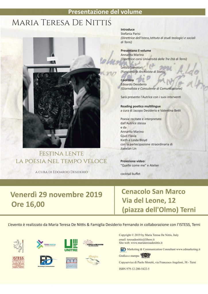 Venerdì 29 novembre alle ore 16,00 al cenacolo San Marco di Terni, si terrà la presentazione del libro “Festina lente. La poesia nel tempo veloce” di Maria Teresa De Nittis, a cura di Edoardo Desiderio.
