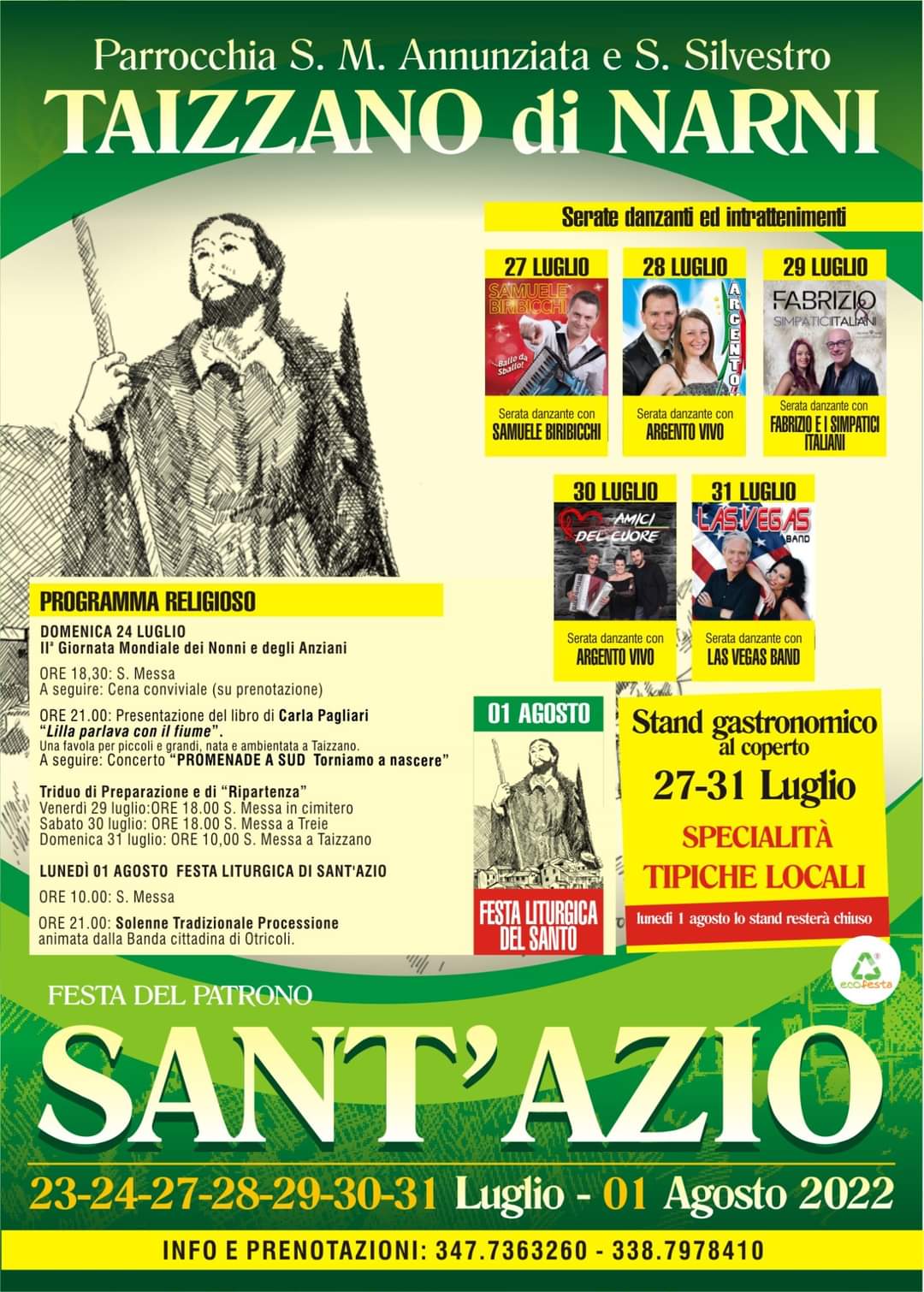 A Taizzano di Narni il 1 agosto si celebra la festa del patrono Sant’Azio con varie manifestazioni religiose e ricreative.