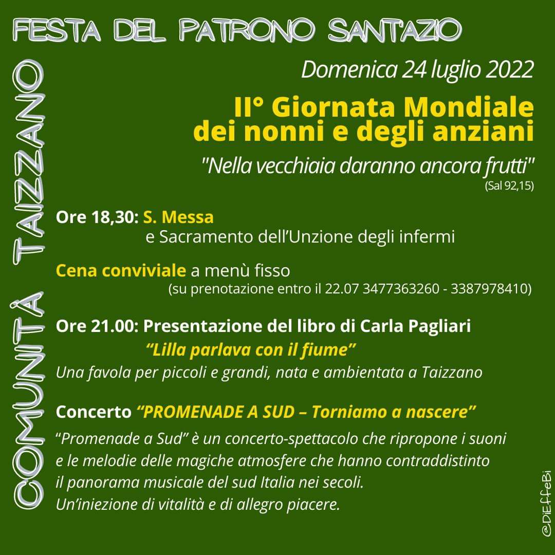 Domenica 24 luglio Giornata Mondiale dei Nonni e degli Anziani, alle ore 18.30 S. Messa. A seguire: Cena conviviale (su prenotazione). Ore 21.00 presentazione del libro di Carla Pagliari “Lilla parlava con il fiume”. Una favola per piccoli e grandi, nata e ambientata a Taizzano. A seguire il concerto”Promenade a sud. Torniamo a nascere”