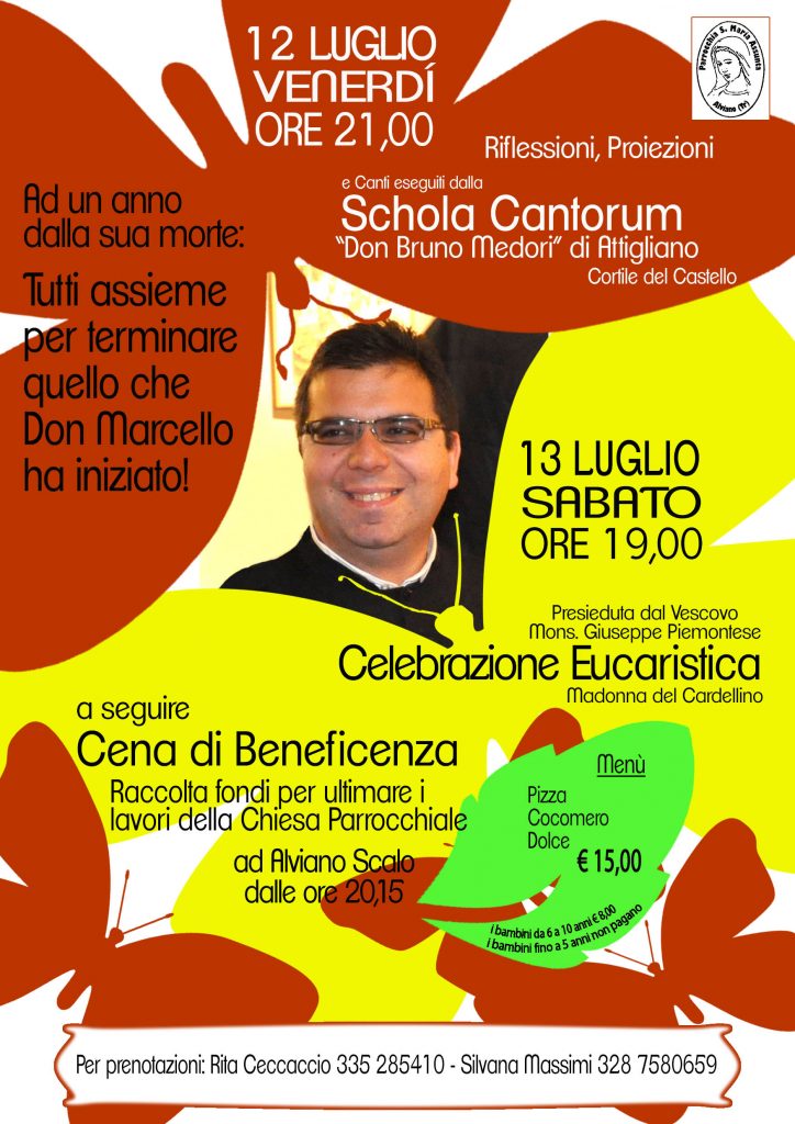 Ad un anno dalla sua morte, la comunità di Alviano e la diocesi hanno ricordato don Marcello D’Artista con il concerto della Schola Cantorum “Don Bruno Medori” di Attigliano, riflessioni e proiezioni il 12 luglio nel cortile del castello di Alviano e con la celebrazione presso la chiesa della Madonna del Cardellino sabato 13 luglio alle ore 19 presieduta dal vescovo Giuseppe Piemontese. E’ stata inoltre organizzata una cena di beneficenza per la raccolta fondi per ultimare i lavori della Chiesa Parrocchiale ad Alviano scalo e portare a conclusione ciò che don Marcello aveva iniziato.