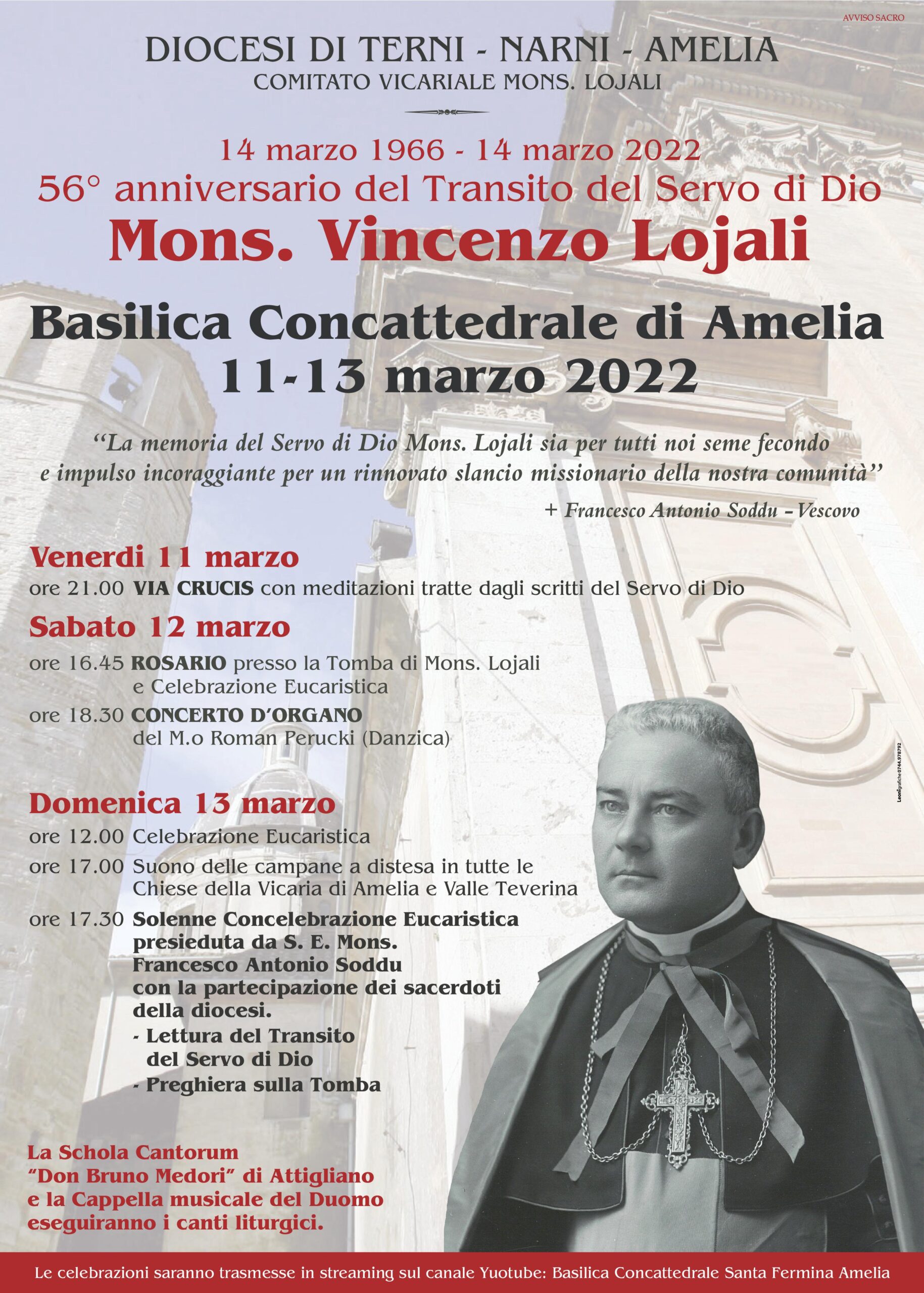 Domenica 13 marzo ore 12.00 Celebrazione Eucaristica. Ore 17.00 Suono delle campane a distesa in tutte le Chiese della Vicaria di Amelia e Valle Teverina e ore 17.30 Solenne Concelebrazione Eucaristica presieduta da Mons. Francesco Antonio Soddu con la partecipazione dei sacerdoti della diocesi. Lettura del Transito del Servo di Dio e preghiera sulla tomba di mons. Lojali. La Schola Cantorum “Don Bruno Medori” di Attigliano e la Cappella musicale del Duomo eseguiranno i canti liturgici.