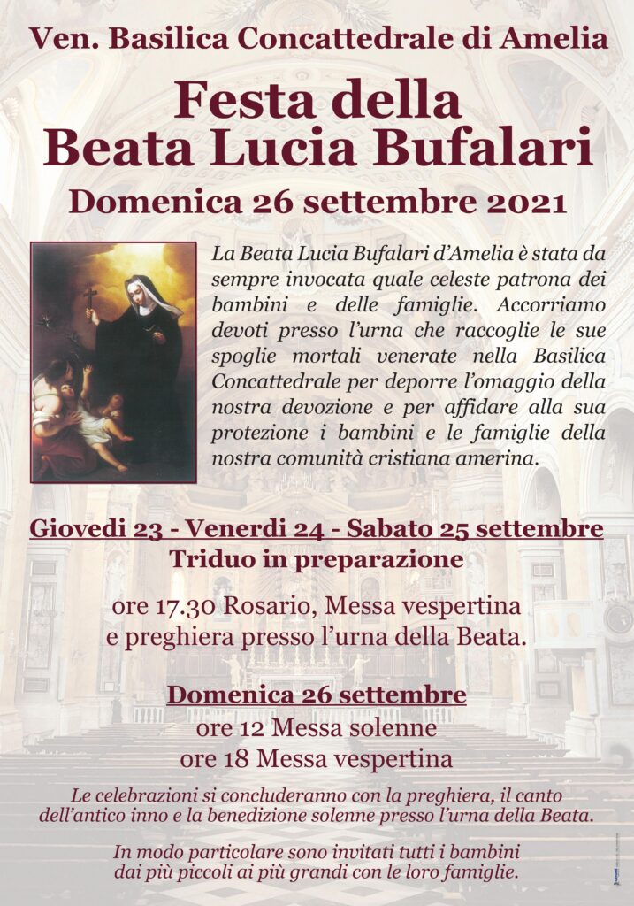 Festa della beata Lucia Bufalari nella concattedrale di Amelia giovedì 23, venerdì 24 e sabato 25 settembre triduo di preparazione con la recita del rosario alle 17.30 e la messa vespertina e preghiera presso l’urna della beata. Domenica 26 settembre ore 12 Messa solenne e ore 18 messa vespertina.