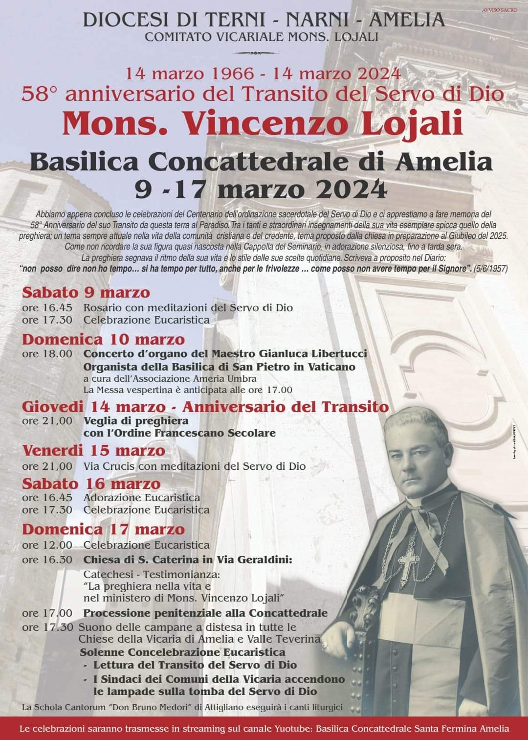 Nel 58° anniversario della morte del Servo di Dio mons. Vincenzo Lojali presso la basilica Concattedrale di Amelia, dal 9 al 17 marzo, ci saranno varie celebrazioni.