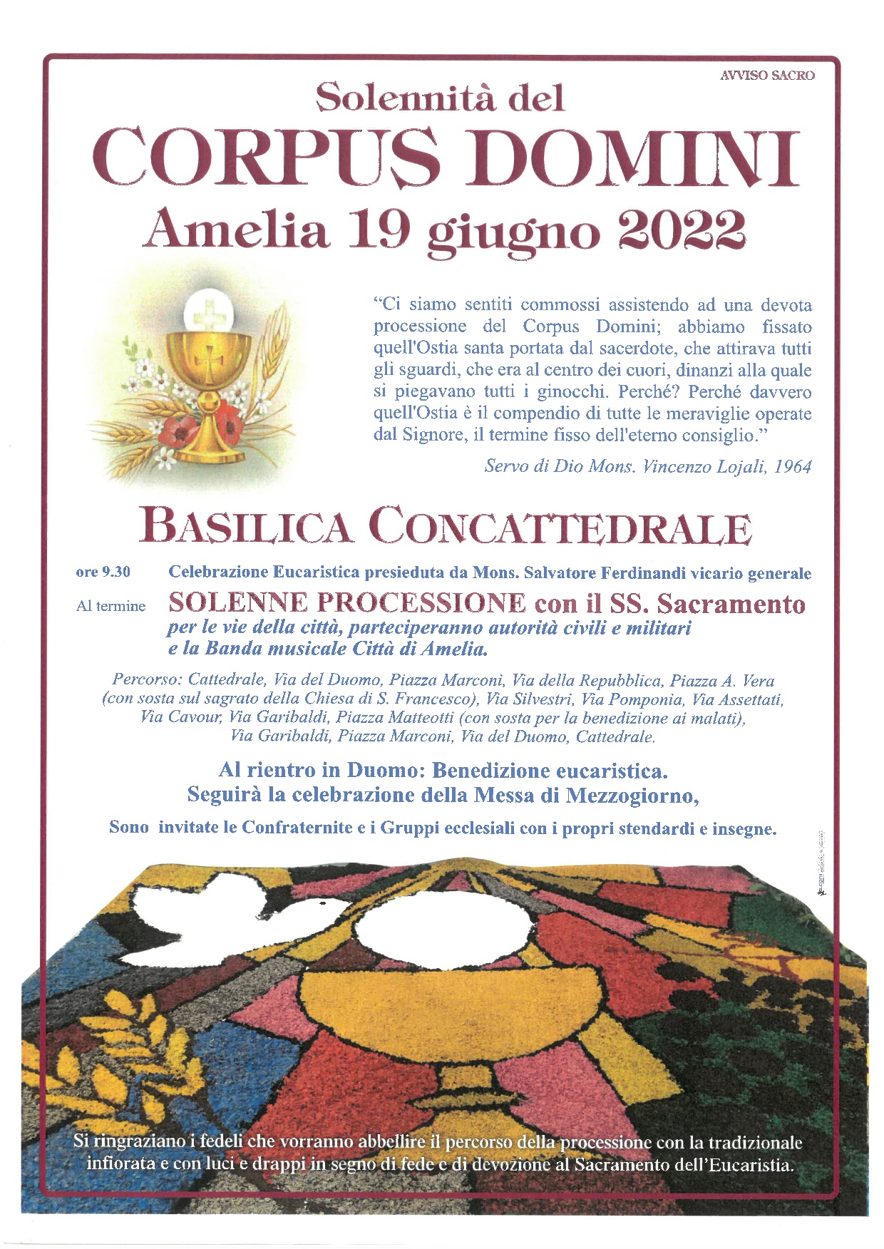 Solennità del Corpus Domini 19 giugno 2022 nella Concattedrale di Amelia alle ore 9.30 ci sarà la Celebrazione Eucaristica presieduta da Mons. Salvatore Ferdinandi vicario generale della diocesi di Terni-Narni-Amelia. Al termine solenne processione con il SS. Sacramento per le vie della città, parteciperanno autorità civili e militari e la Banda musicale Città di Amelia. Percorso: Cattedrale, Via del Duomo, Piazza Marconi, Via della Repubblica, Piazza A. Vera (con sosta sul sagrato della Chiesa di S. Francesco), Via Silvestri, Via Pomponia, Via Assettati, Via Cavour, Via Garibaldi, Piazza Matteotti (con sosta per la benedizione ai malati), Via Garibaldi, Piazza Marconi, Via del Duomo, Cattedrale.