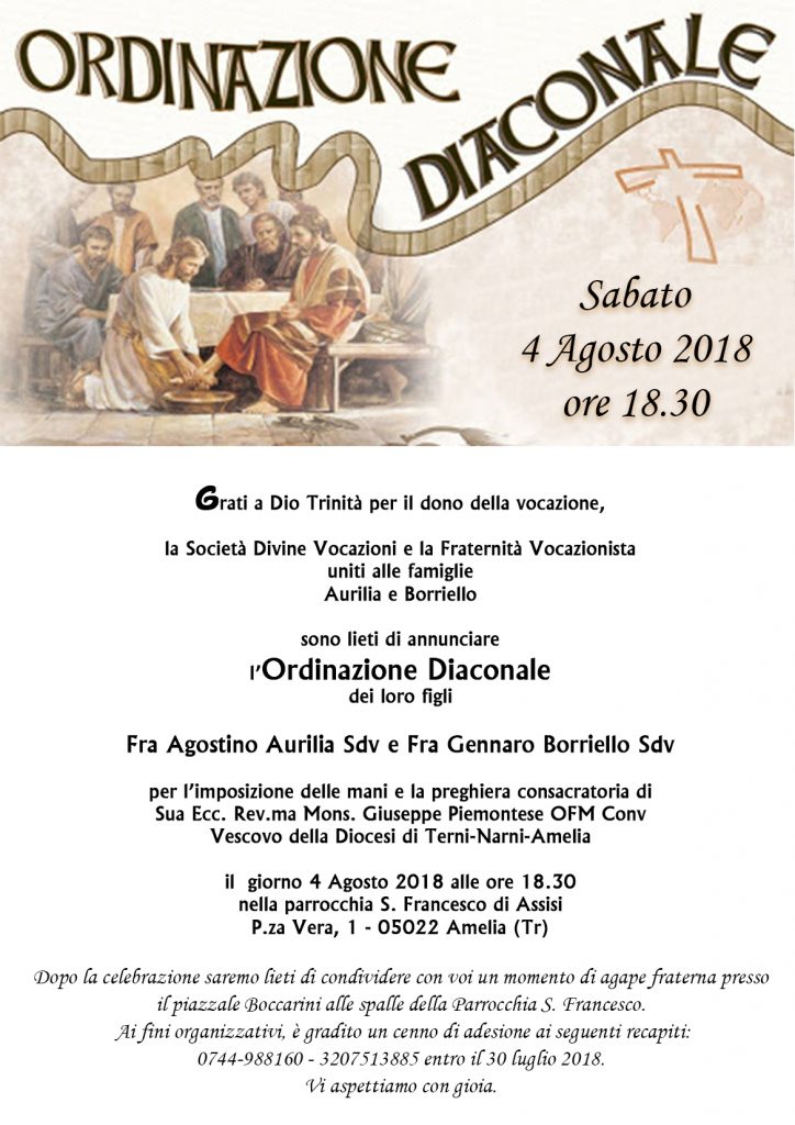 Sabato 4 agosto 2018 ore 18.30 nella chiesa di san Francesco ad Amelia sono stati ordinati diaconi per imposizione delle mani e la preghiera consacratoria del vescovo Giuseppe Piemontese, fra Agostino Aurilia e fra Gennaro Borriello della Società divine vocazioni, ala presenza del superiore generale della congregazione Società Divine Vocazioni Padre Antonio Rafael do Nascimento, del vicario generale padre Ciro M. Sarnataro Sdv.