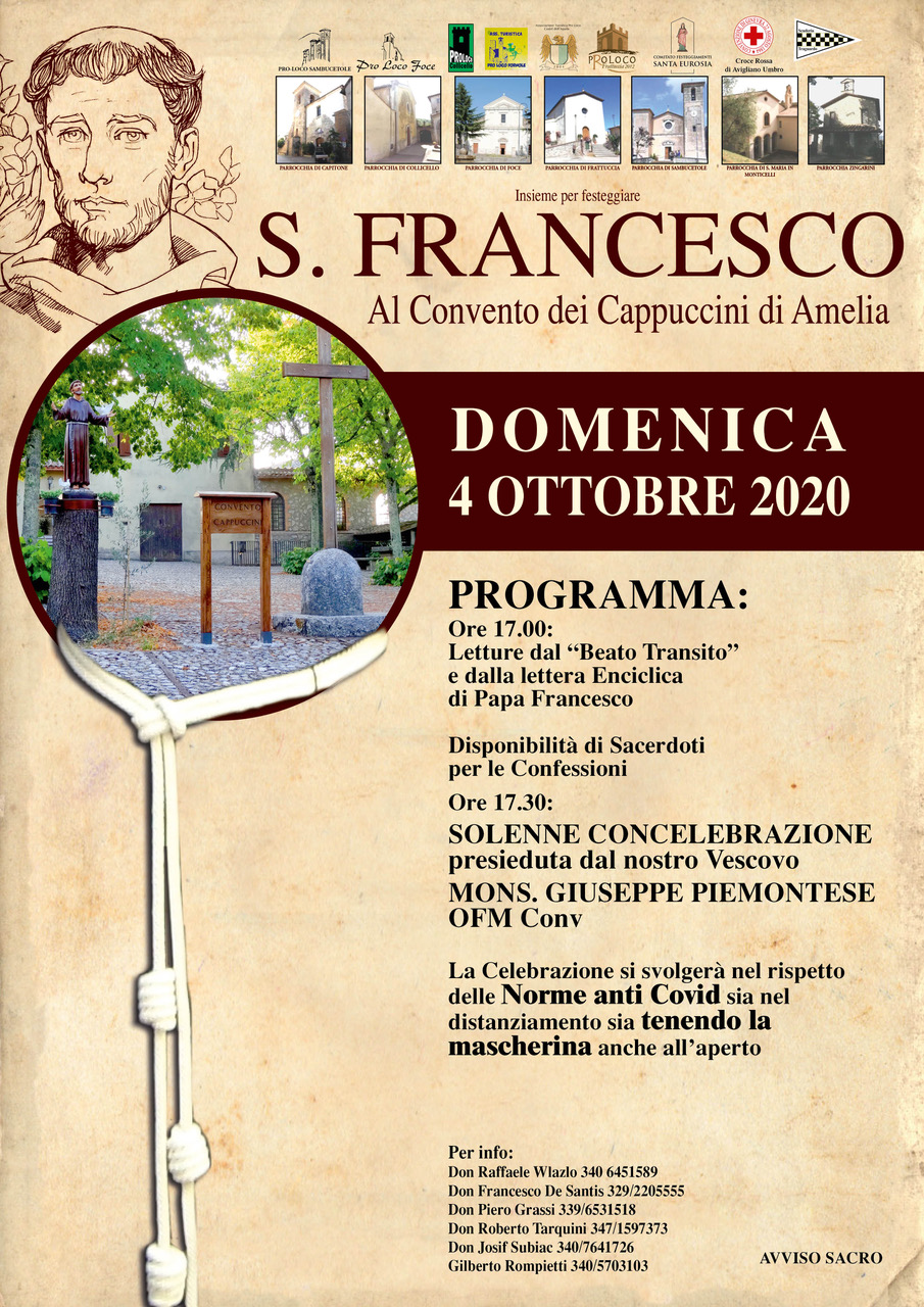 Domenica 4 ottobre 2020 presso il Convento dei Cappuccini di Amelia sarà festeggiato il Santo di Assisi insieme alle parrocchie di Collicello, Frattuccia, Sambucetole, Foce, Capitone, S. Giuseppe da Leonessa “Zingarini”, Macchie, Fornole Per il sesto anno l’iniziativa è organizzata dalle Proloco del territorio e dal comitato festeggiamenti Sant’Eurosia e dal consiglio pastorale di Sambucetole e le associazioni del territorio.