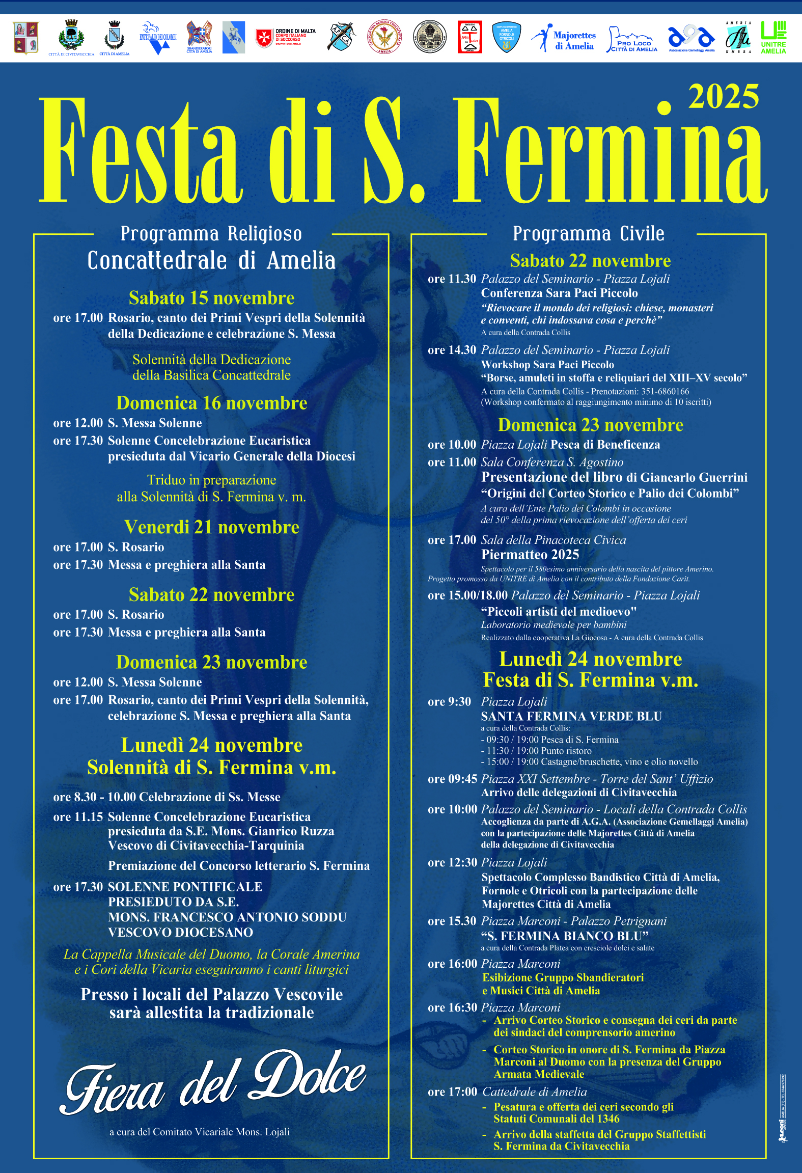 Lunedì 24 novembre, solennità di Santa Fermina ore 8.30-10.00 concattedrale di Amelia Celebrazione di Sante Messe, ore 11.15 Solenne Concelebrazione Eucaristica presieduta da mons. Gianrico Ruzza Vescovo di Civitavecchia-Tarquinia con la partecipazione dei sacerdoti della città di Civitavecchia. Al termine premiazione del Concorso letterario S. Fermina.