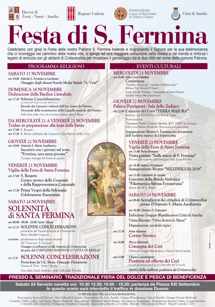 Alle ore 17.30 la solenne celebrazione nella Cattedrale di Amelia sarà presieduta da padre Giuseppe Piemontese, vescovo di Terni-Narni-Amelia, alla presenza dei sacerdoti della diocesi e dei sindaci di Civitavecchia, Amelia, Alviano, Attigliano, Giove, Guardea, Lugnano in Teverina e Penna in Teverina, animata dalla corale “Amerina”. La celebrazione sarà preceduta alle 17 dalla rievocazione storica della pesatura e offerta dei ceri, secondo gli Statuti del 1346 e dall’accensione dei ceri con la “Fiaccola S. Fermina” portata dalle associazioni sportive di Civitavecchia. Nei tradizionali abiti del Trecento, i rappresentanti dei borghi del territorio comunale offrono alla patrona grossi ceri il cui peso equivale simbolicamente a quello dei nuclei familiari presenti nel borgo che essi amministrano.