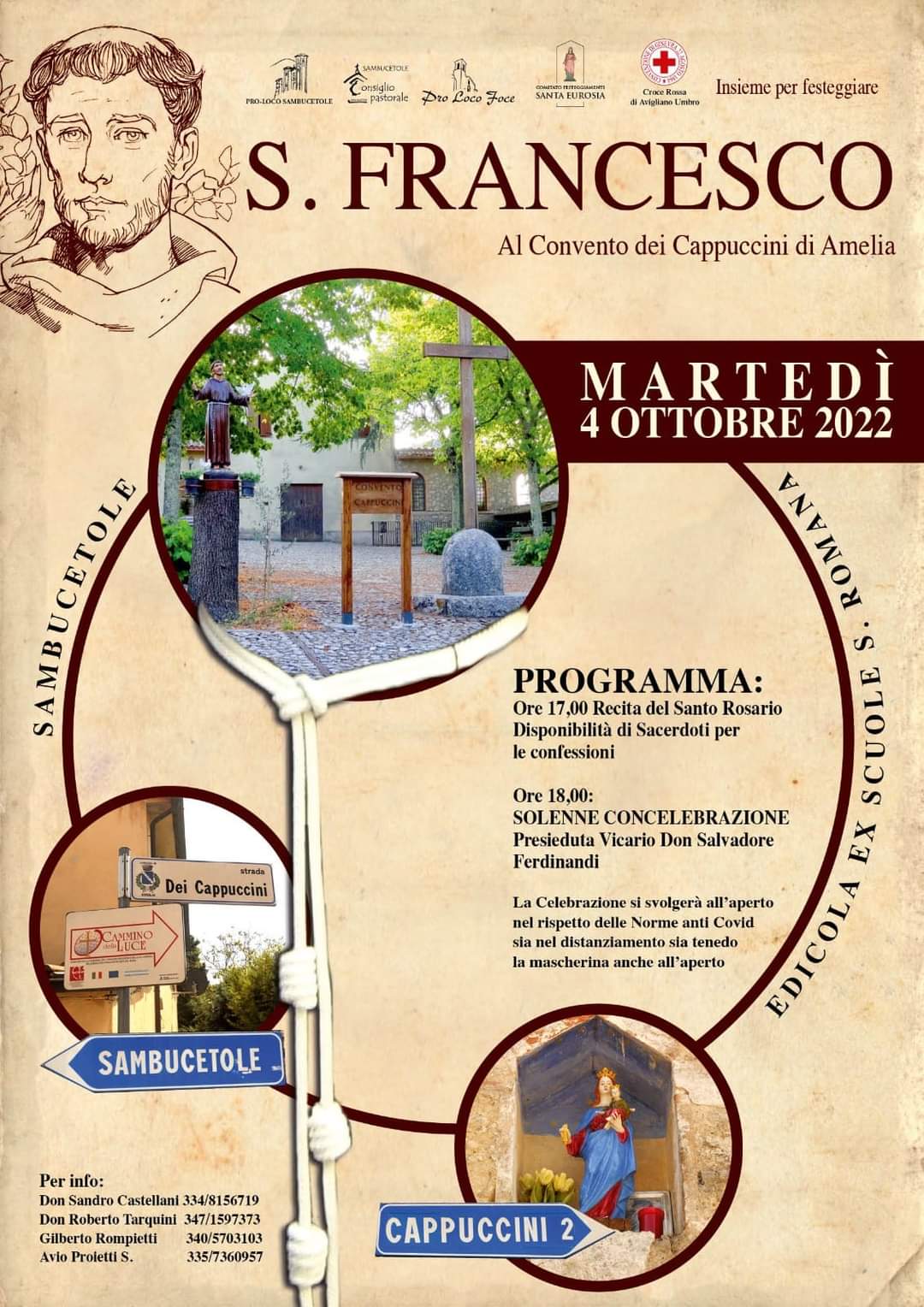 Martedì 4 ottobre presso il Convento dei Cappuccini di Amelia sarà festeggiato il Santo di Assisi insieme alle parrocchie di Collicello, Frattuccia, Sambucetole, Foce, Capitone, S. Giuseppe da Leonessa “Zingarini”, Macchie, Fornole Per il sesto anno l’iniziativa è organizzata dalle Proloco del territorio e dal comitato festeggiamenti Sant’Eurosia e dal consiglio pastorale di Sambucetole e le associazioni del territorio.