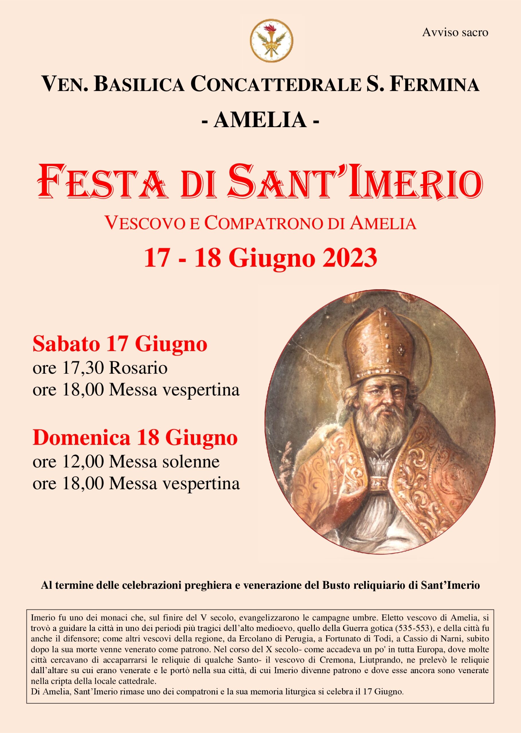 Nella concattedrale di Amelia sabato 17 e domenica 18 celebrazioni in onore del patrono Sant’Imerio. Sabato 17 Giugno ore 17,30 Rosario ore 18,00 Messa vespertina. Domenica 18 Giugno ore 12,00 Messa solenne ore 18,00 Messa vespertina. Al termine delle celebrazioni preghiera e venerazione del Busto reliquiario di Sant’Imerio