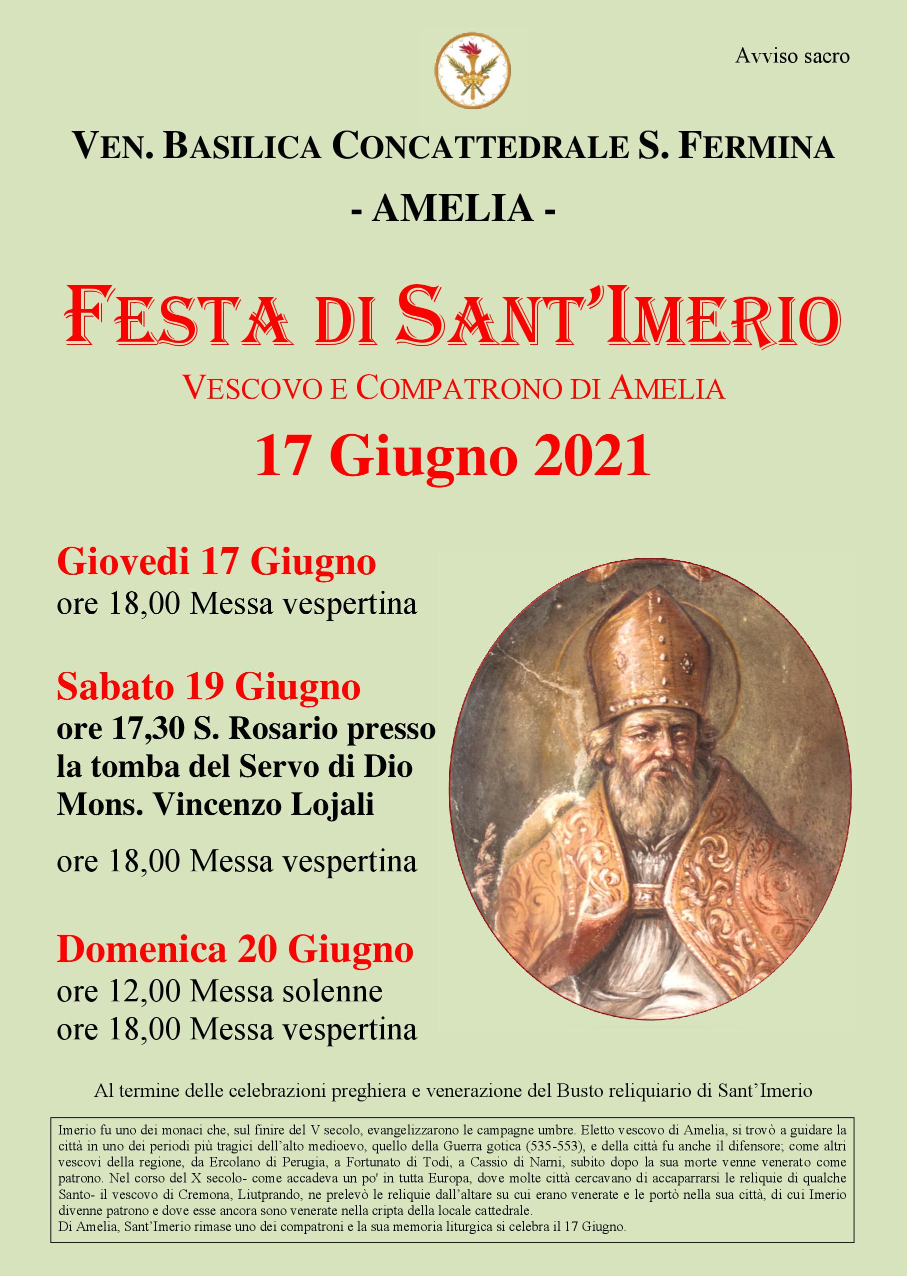 Nella concattedrale di Amelia si festeggia a sant’Imerio vescovo e copatrono di Amelia, domenica 20 giugno alle ore 12 con la solenne messa e alle 18 la messa vespertina. Al termine delle celebrazioni preghiera e venerazione del busto reliquiario di Sant’Imerio.