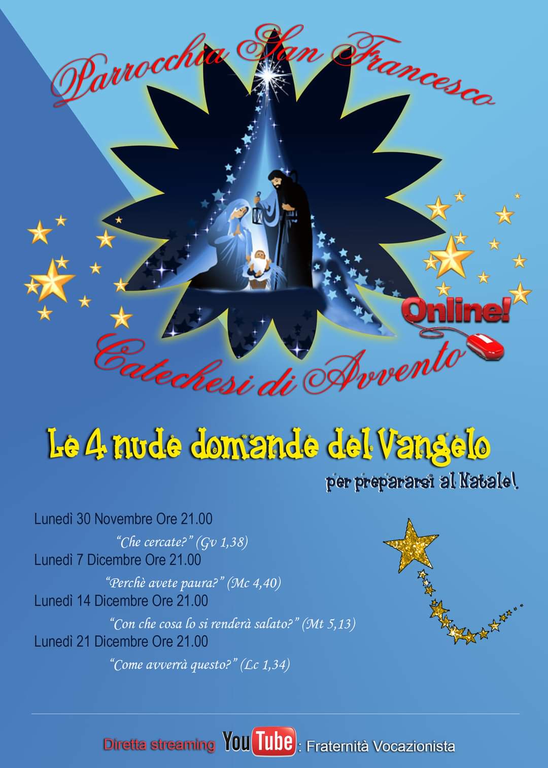 “Le 4 nude domande del Vangelo” è il tema delle catechesi on line del lunedì 30 novembre, 7-14-21 dicembre alle ore 21