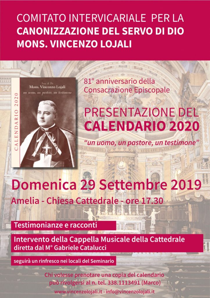 Domenica 29 Settembre 2019 nella concattedrale di Amelia alle ore 17.30 si terrà la presentazione del calendario 2020 “Un uomo, un pastore, un testimone” dedicato a mons. Vincenzo Lojali, con testimonianze e racconti.