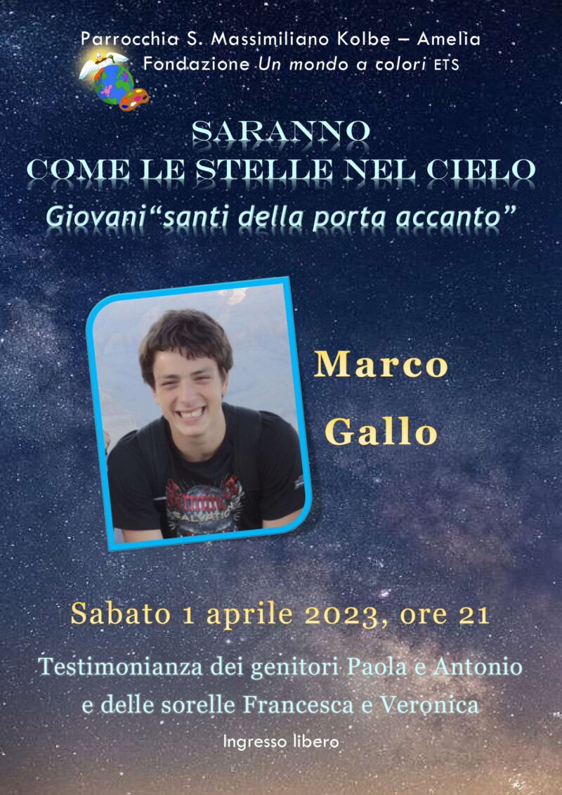 Sabato 1 aprile 2023 alle ore 21.00, presso la parrocchia di San Massimiliano Kolbe, in Amelia, ci sarà la testimonianza su Marco Gallo. Saranno presenti i genitori Paola e Antonio con le sorelle Francesca e Veronica.