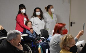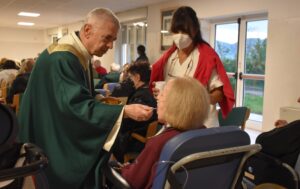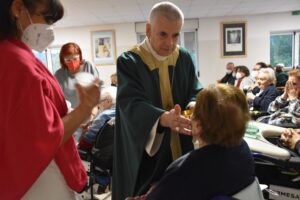 Un incontro gioioso e commovente è stato quello del vescovo Francesco Antonio Soddu con gli anziani della residenza protetta di Collerolletta che la cooperativa Actl gestisce attraverso la Salus Umbria Terni e che ospita circa 90 anziani autosufficienti e non. Dopo due anni di ristrettezze e di isolamento a causa del Covid 19, insieme al gruppo dei volontari della Comunità di Sant’Egidio guidati dalla dott.ssa Maria Grazia Proietti, che da venti anni seguono gli anziani e operatori della residenza, il vescovo ha salutato tutti gli ospiti, i familiari e personale di servizio, che lo hanno accolto con un applauso. E’ seguita la celebrazione della messa nel grande salone riservato alle attività del centro diurno. Il vescovo ha augurato a tutti di essere sempre sereni, di continuare ad essere attivi, guardare avanti e non perdere mai la speranza. “Auguri per tutto quello che desiderate di bene per voi, per la vostra famiglia, per le persone a voi care” ha detto, porgendo una carezza a tutti.