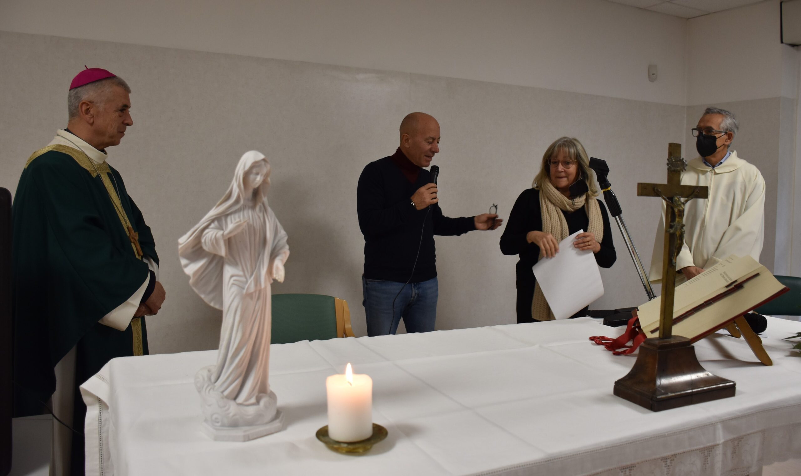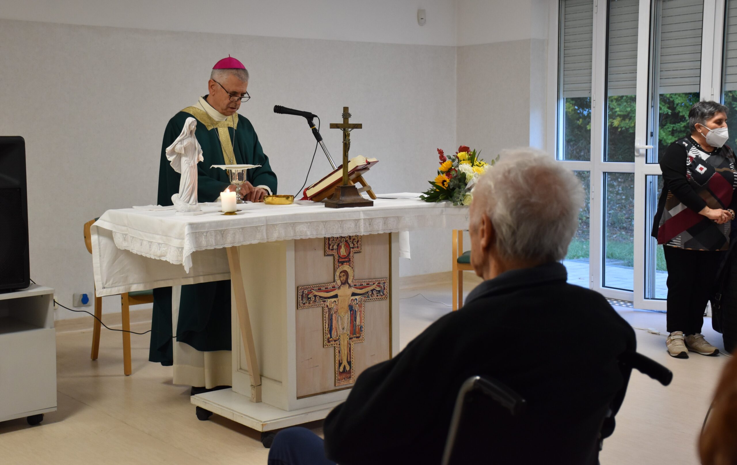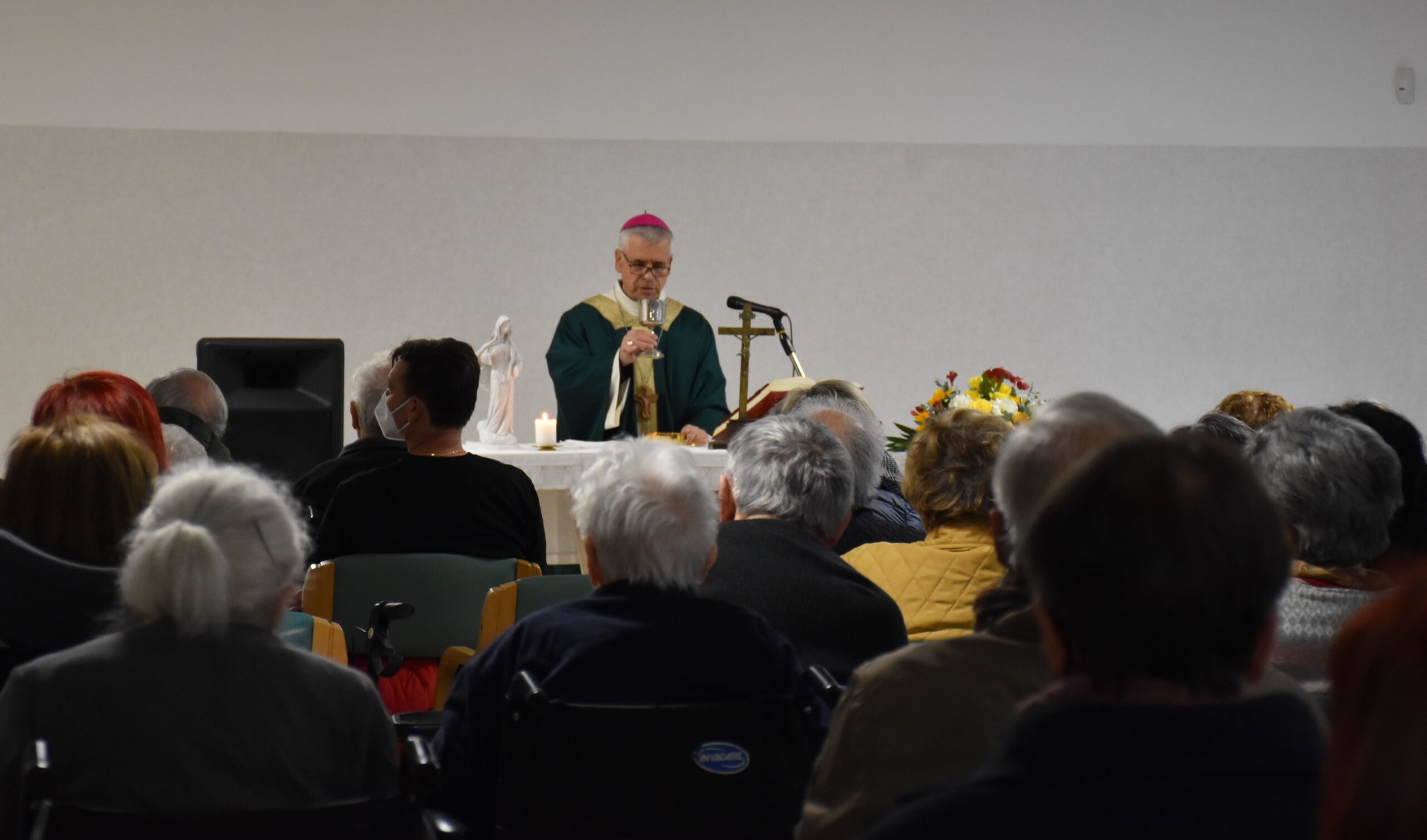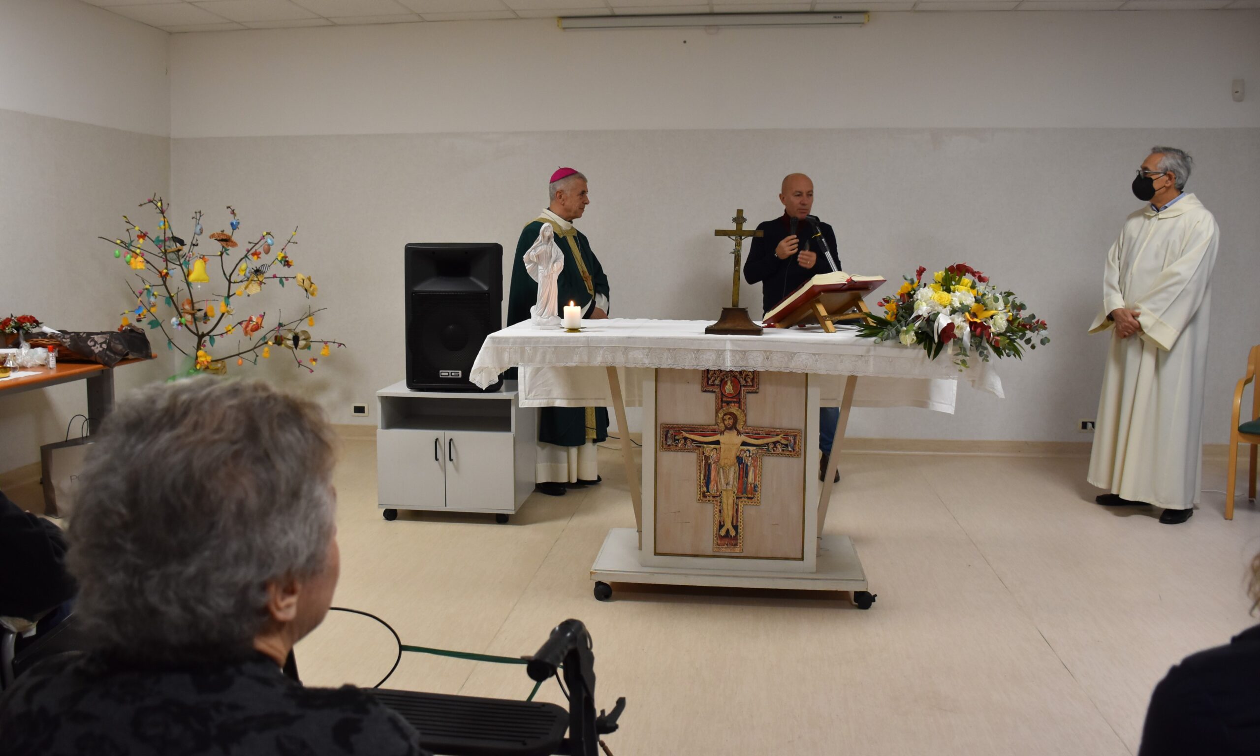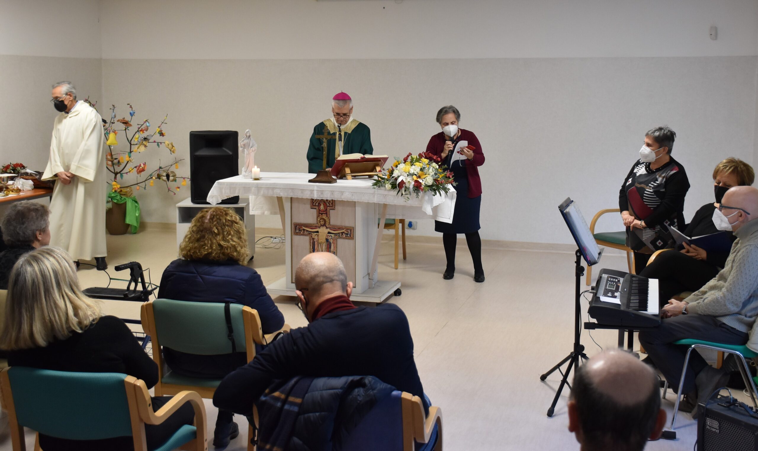 Un incontro gioioso e commovente è stato quello del vescovo Francesco Antonio Soddu con gli anziani della residenza protetta di Collerolletta che la cooperativa Actl gestisce attraverso la Salus Umbria Terni e che ospita circa 90 anziani autosufficienti e non. Dopo due anni di ristrettezze e di isolamento a causa del Covid 19, insieme al gruppo dei volontari della Comunità di Sant’Egidio guidati dalla dott.ssa Maria Grazia Proietti, che da venti anni seguono gli anziani e operatori della residenza, il vescovo ha salutato tutti gli ospiti, i familiari e personale di servizio, che lo hanno accolto con un applauso. E’ seguita la celebrazione della messa nel grande salone riservato alle attività del centro diurno. Il vescovo ha augurato a tutti di essere sempre sereni, di continuare ad essere attivi, guardare avanti e non perdere mai la speranza. “Auguri per tutto quello che desiderate di bene per voi, per la vostra famiglia, per le persone a voi care” ha detto, porgendo una carezza a tutti.