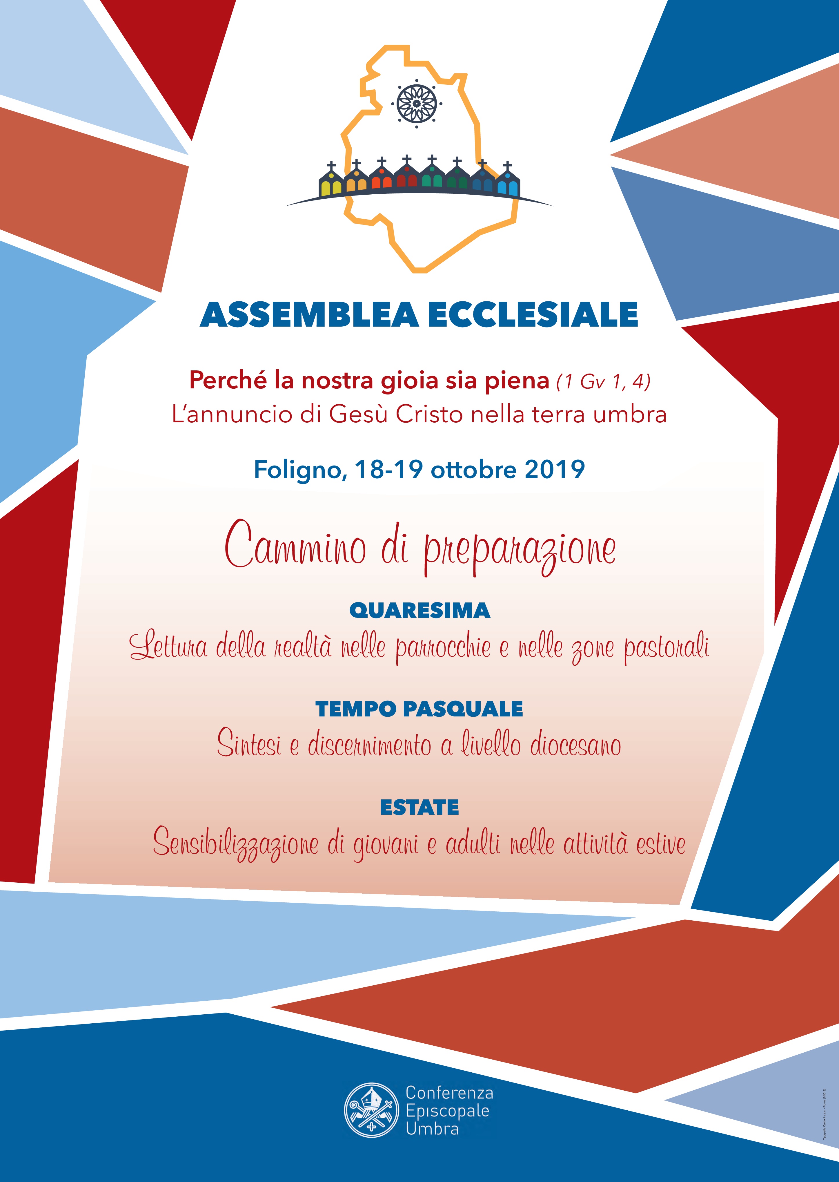 Le otto Chiese diocesane dell’Umbria celebreranno a Foligno, il 18 e 19 ottobre 2019, l’Assemblea ecclesiale regionale dal tema “Perché la nostra gioia sia piena (1 Gv 1,4): l’annuncio di Gesù Cristo nella terra umbra”. L’iniziativa è stata presentata alla stampa, a Perugia, dall’arcivescovo di Spoleto-Norcia e presidente della Conferenza episcopale umbra mons. Renato Boccardo. «Come Vescovi – ha detto – abbiamo più volte riflettuto su come rispondere all’appello che papa Francesco ci ha lanciato al convegno di Firenze del 2015 sulla necessità di attuare la sinodalità per guardare al presente con discernimento, al futuro con fiducia, osando il cambiamento».