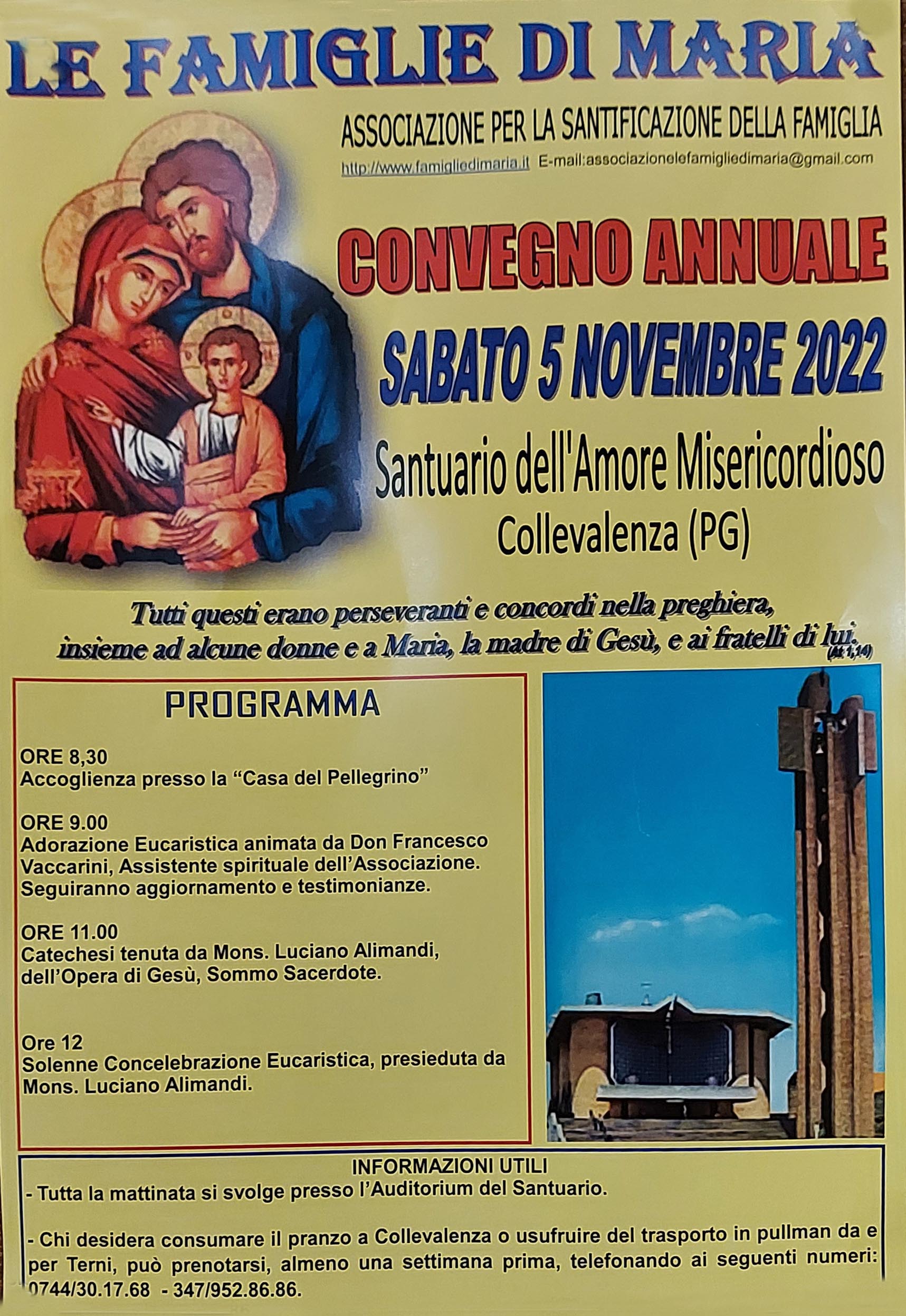 INFORMAZIONI UTILI – Tutta la mattinata si svolge presso l’Auditorium del Santuario. – Chi desidera consumare pranzo a Collevalenza o usufruire del trasporto in pullman da e per Terni, può prenotarsi, almeno una settimana prima, telefonando ai seguenti numeri: 0744/30.17.68