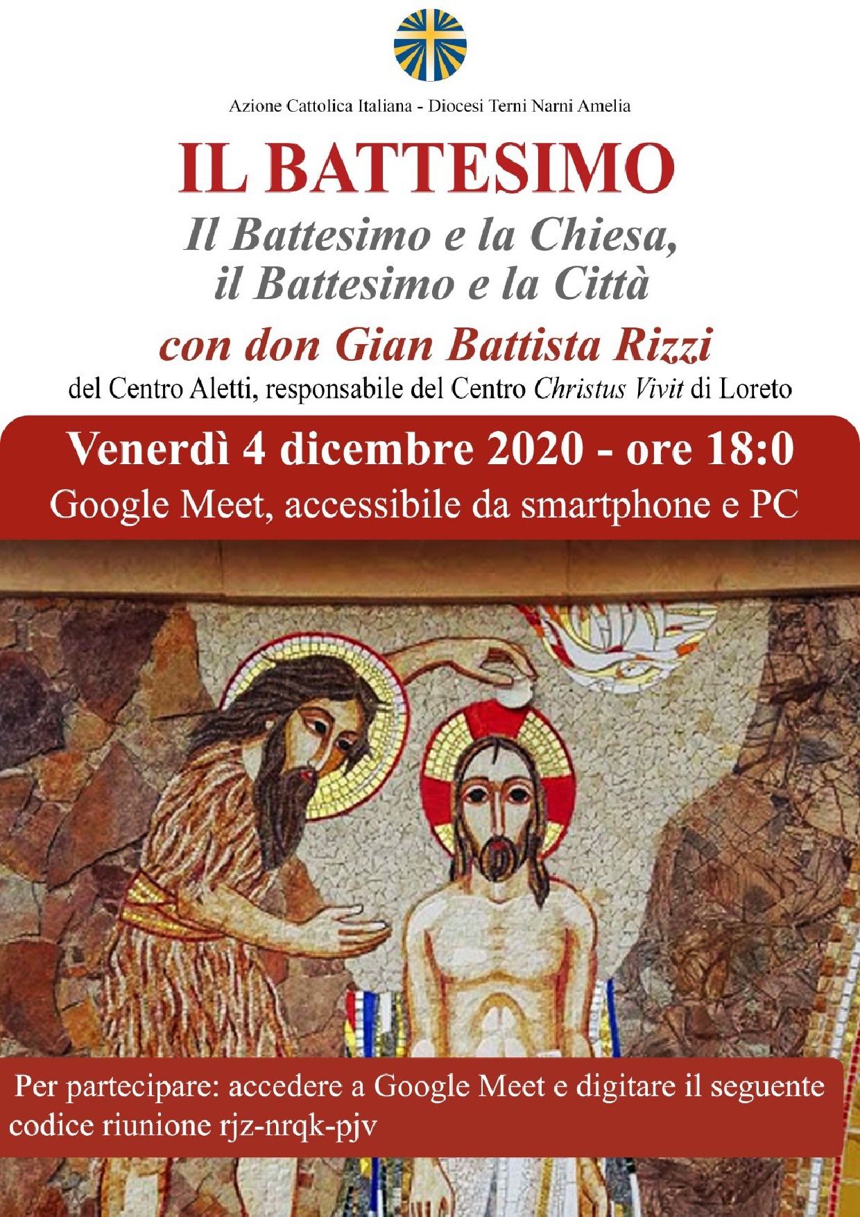 In preparazione alla giornata dell’adesione si terrà l’iniziativa della “Grande Catechesi” venerdì 4 dicembre alle ore 18 su Google Meet, dedicata al tema: “Il Battesimo e la Chiesa, il Battesimo e la Città” guidata da Don Gianni Battista Rizzi responsabile del centro Christus Vivit di Loreto.