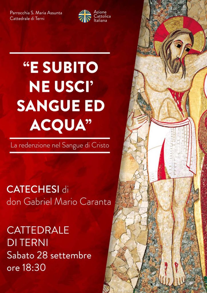 Notizie 22 Settembre 2019 Azione Cattolica – catechesi per adulti Sabato 28 settembre ore 18.30 Cattedrale di Terni “E subito ne usci sangue ed acqua” la redenzione nel sangue di Cristo a cura di don Gabriel Mario Caranta