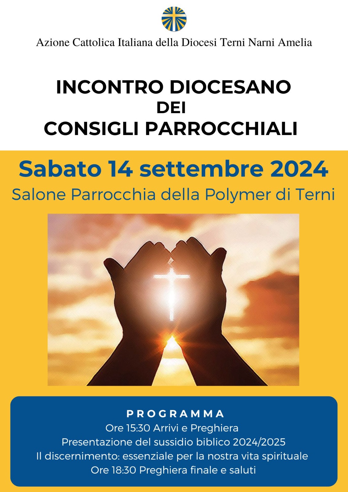 L’Azione Cattolica di Terni-Narni-Amelia ad inizio anno pastorale si riunisce sabato 14 settembre 2024 presso la parrocchia della Immacolata Concezione di Terni per l’incontro diocesano dei consigli parrocchiali, dalle ore 15.30 alle 18.30 dedicato al tema: “Il discernimento: essenziale per la nostra vita spirituale”.