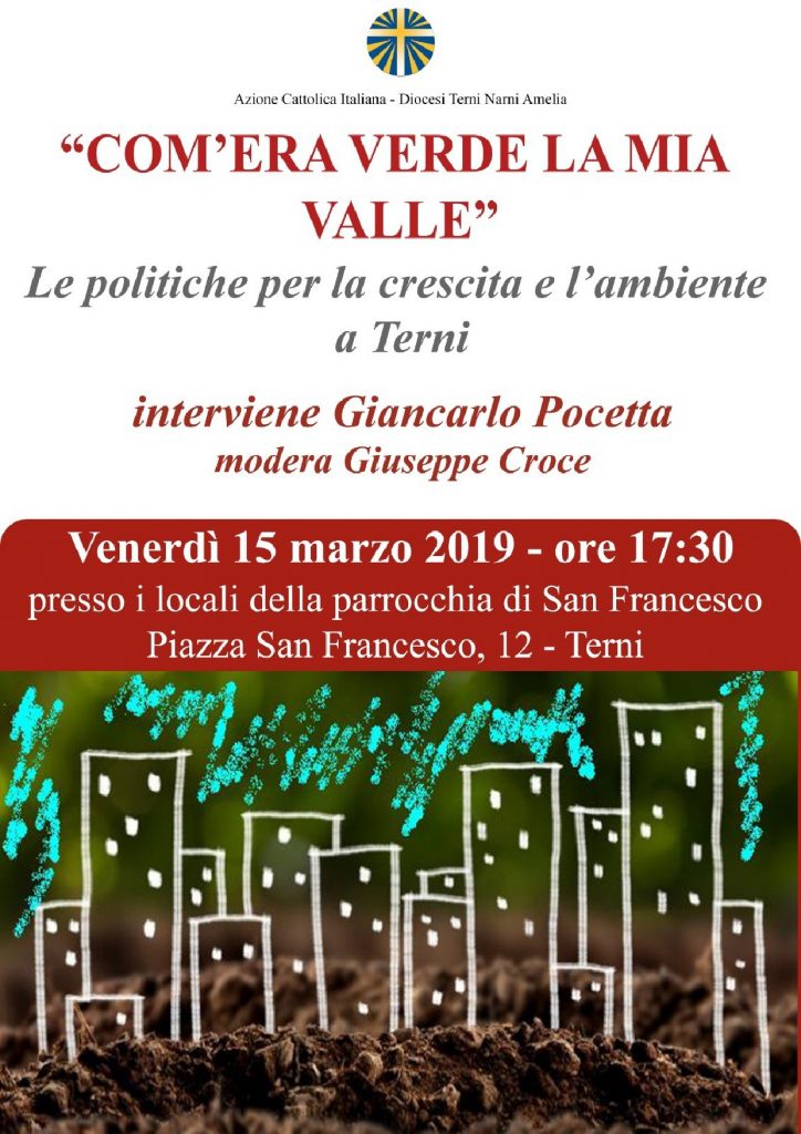 Venerdì 15 marzo alle ore 17.30 presso la parrocchia di San Francesco a Terni iniziativa del discernimento organizzata dalla Azione Cattolica diocesana dedicata agli aspetti ambientali ed epidemiologici del territorio ternano. “Come era verde la mia valle” a cura del prof. Giuseppe Croce economista Università La Sapienza Roma ed del Dr. Giancarlo Pocetta docente presso la cattedra di Igiene dell’ Università di Perugia.