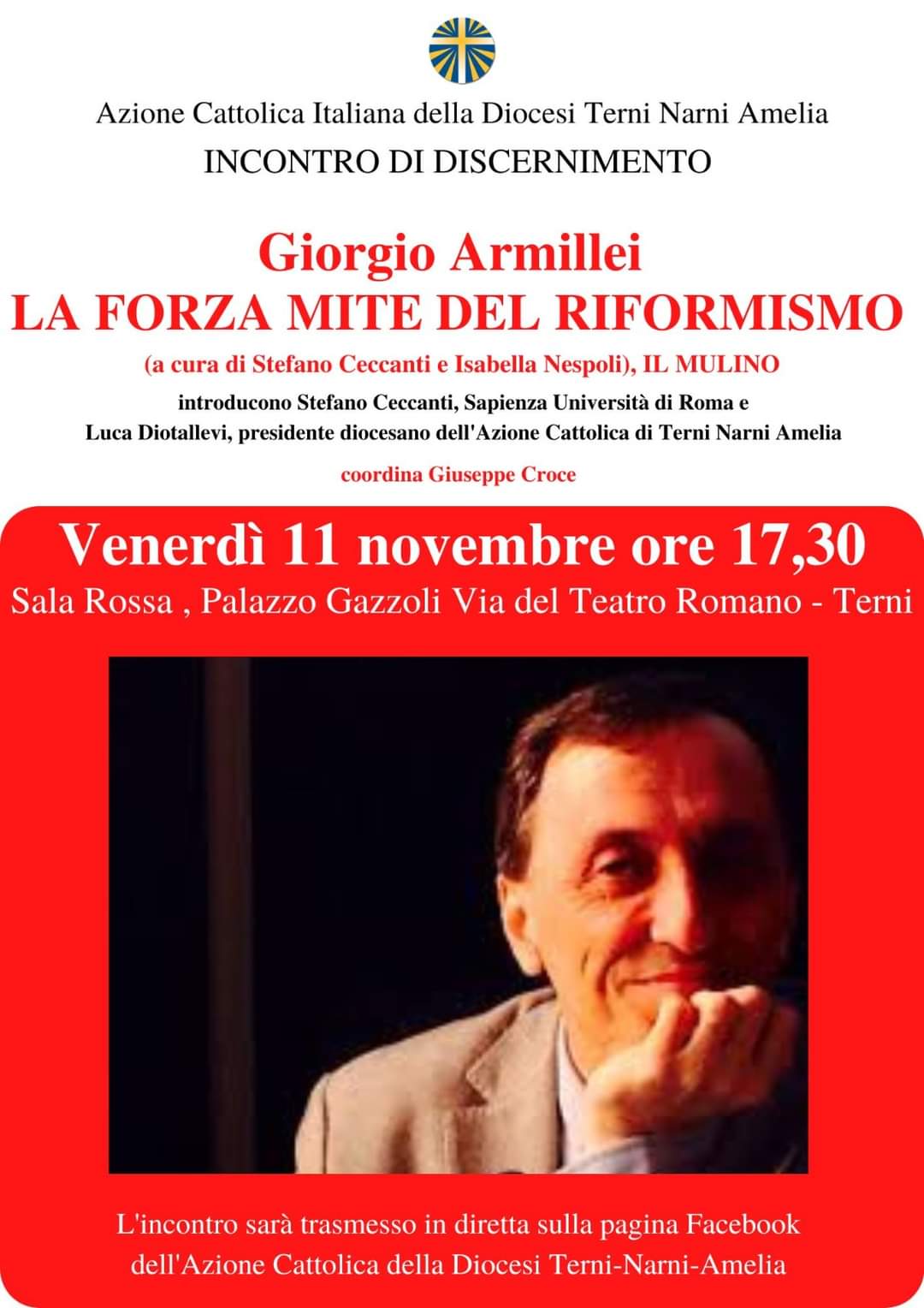 Venerdì 11 novembre alle ore 17.30 nella Sala Rossa di Palazzo Gazzoli a Terni si terrà l’incontro promossso dall’Azione Cattolica Italiana della Diocesi Terni-Narni-Amelia per la presentazione del libro dedicato a Giorgio Armillei “La forza mite del riformismo” a cura di Stefano Ceccanti e Isabella Nespoli, edizioni Il Mulino.