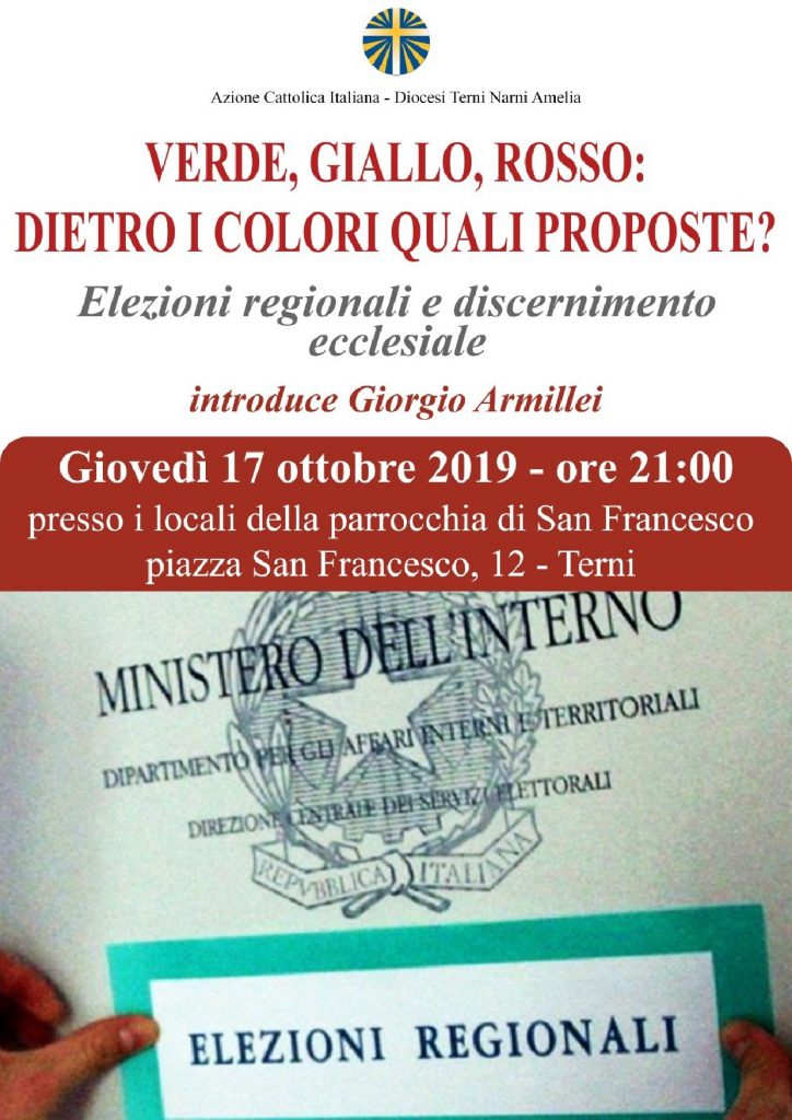 L’Azione Cattolica Diocesana organizza per il giorno 17 ottobre alle ore 21 presso i locali della Parrocchia S. Francesco in Terni un discernimento pubblico per riflettere sulle prossime Elezioni regionali. “Verde, giallo e rosso: dietro i colori quali proposte?” è il tema dell’incontro introdotto da Giorgio Armillei.