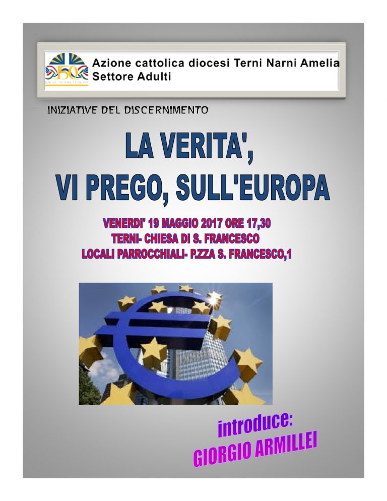 Venerdì 19 maggio alle ore 17.30 presso la sala parrocchiale della chiesa di San Francesco in Terni si terrà l’incontro del discernimento comunitario: “La verità vi prego sull’Europa” sulla situazione dell’Europa con riferimenti anche temi specifici della situazione italiana, proposto dall’Azione cattolica diocesana adulti. Introduce: Giorgio Armillei.
