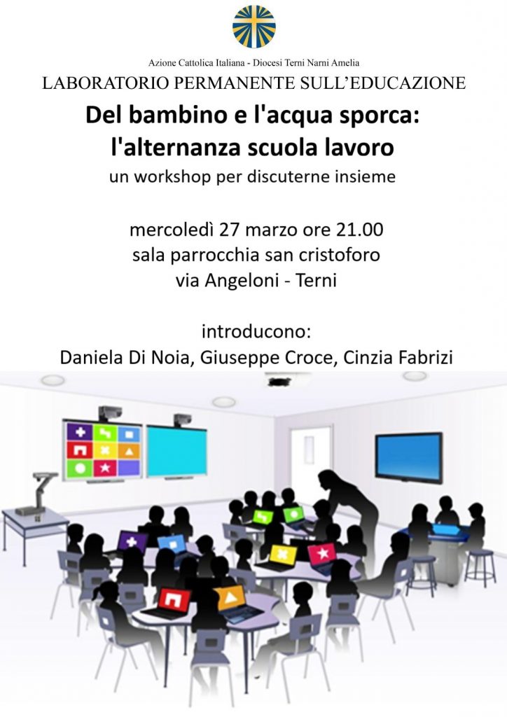 Mercoledì 27 marzo alle ore 21.00 nella sala della parrocchia di San Cristoforo a si terrà l’incontro: “Del bambino e l’acqua sporca: l’alternanza scuola lavoro un workshop per discuterne insieme” a cura dell’Azione Cattolica Italiana nell’ambito del progetto Laboratorio permanente sull’educazione.
