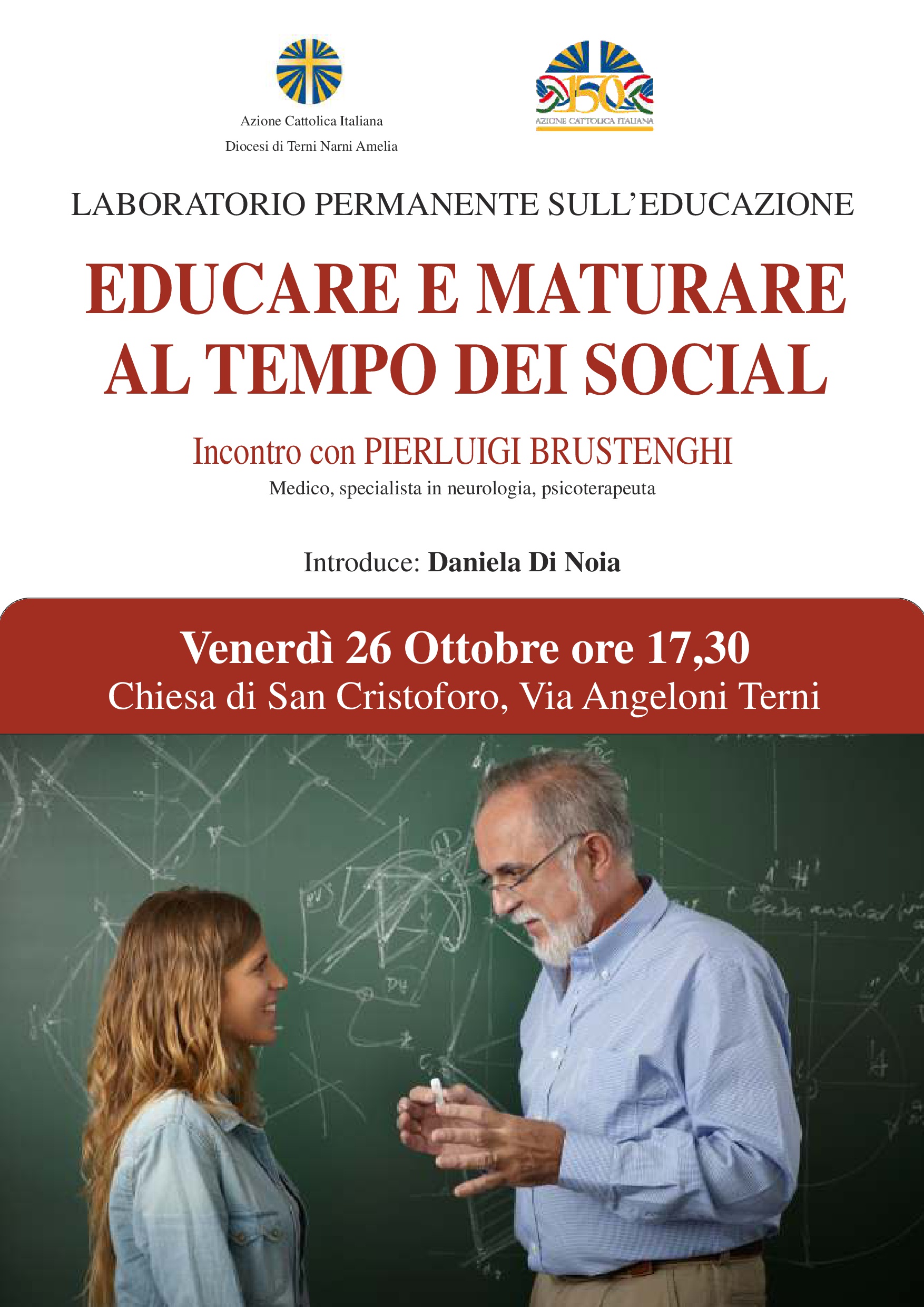 Venerdì 26 ottobre ore 17.30 nella chiesa di San Cristoforo incontro del laboratorio permanente sull’educazione promosso dall’Azione Cattolica di Terni. “Educare e maturare al tempo dei social” il tema trattato da Pierluigi Brustenghi  medico, specialista in neurologia, psicoterapeuta