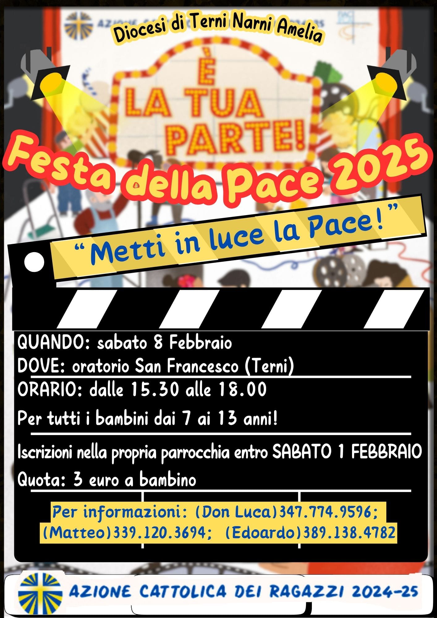 “Metti in luce la Pace!” è lo slogan della festa diocesana della Pace dell’Acr che si terrà nell’oratorio di San Francesco a Terni sabato 8 febbraio dalle 15.30 alle 18. Un pomeriggio all’insegna del divertimento e della condivisione, approfondendo il tema della della pace che è seme della fraternità cristiana, nell’ambito delle manifestazioni in onore di San Valentino 2025 dedicate al tema: “Nel Giubileo pellegrini di speranza con San Valentino”.