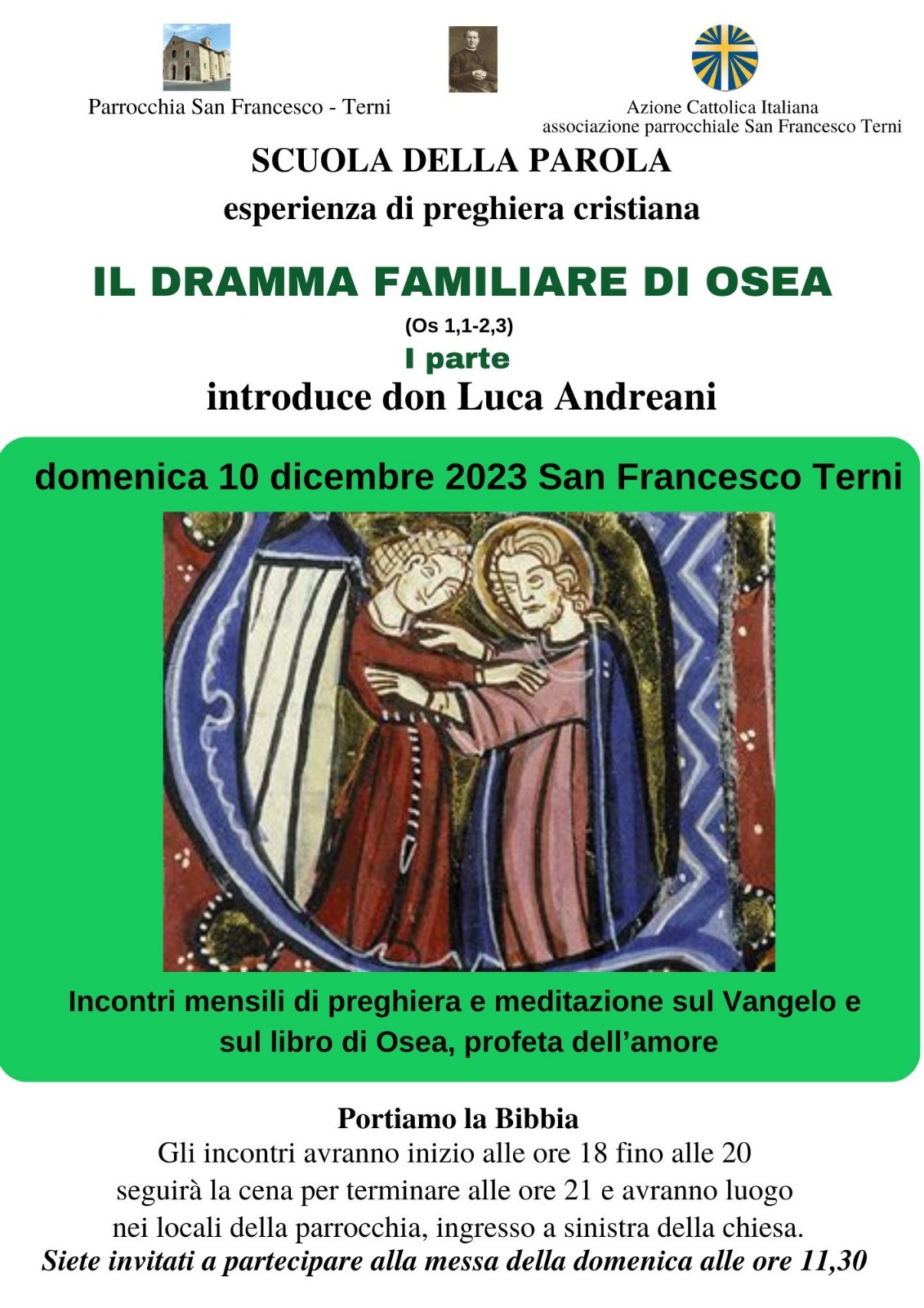 Domenica 10 dicembre 2023 alle ore 18 presso la parrocchia di San Francesco – Salesiani, si terrà il terzo appuntamento della Scuola della Parola esperienza di preghiera cristiana, promossa dall’Azione Cattolica Italiana – Associazione Parrocchiale San Francesco – Terni – e dalla Commissione Parrocchiale Evangelizzazione e Catechesi degli Adulti e Famiglia. Tema dell’incontro sarà: “Il dramma familiare di Osea” con l’introduzione di don Luca AndreaniANDREANI. Si ricorda di portare la Bibbia. L’incontro si concluderà alle 20 con un momento di conviviale fraternità.