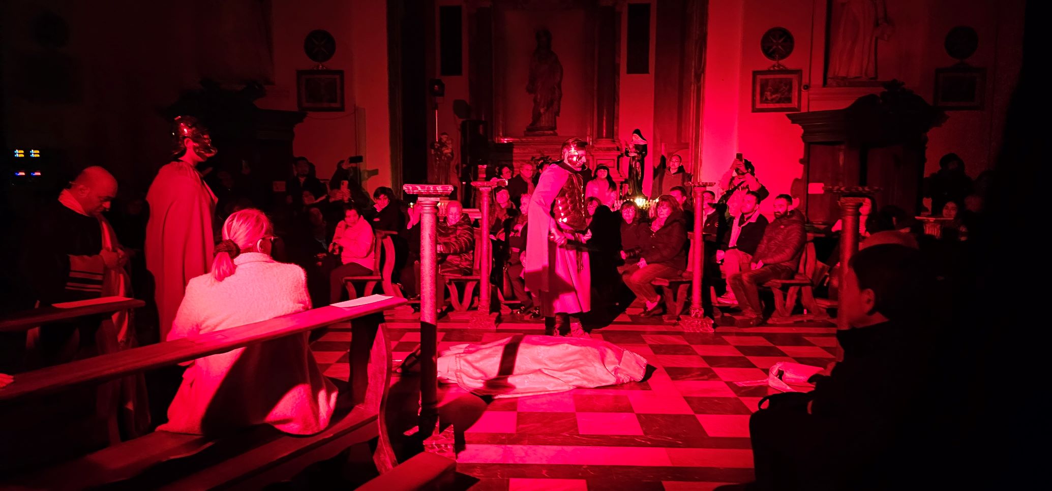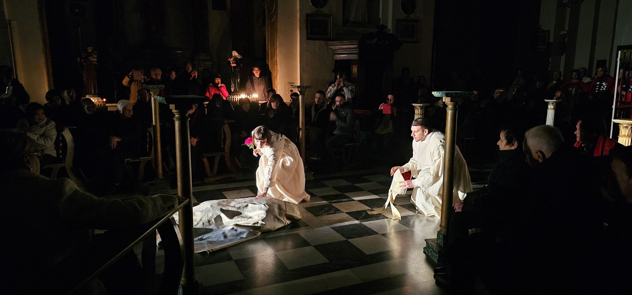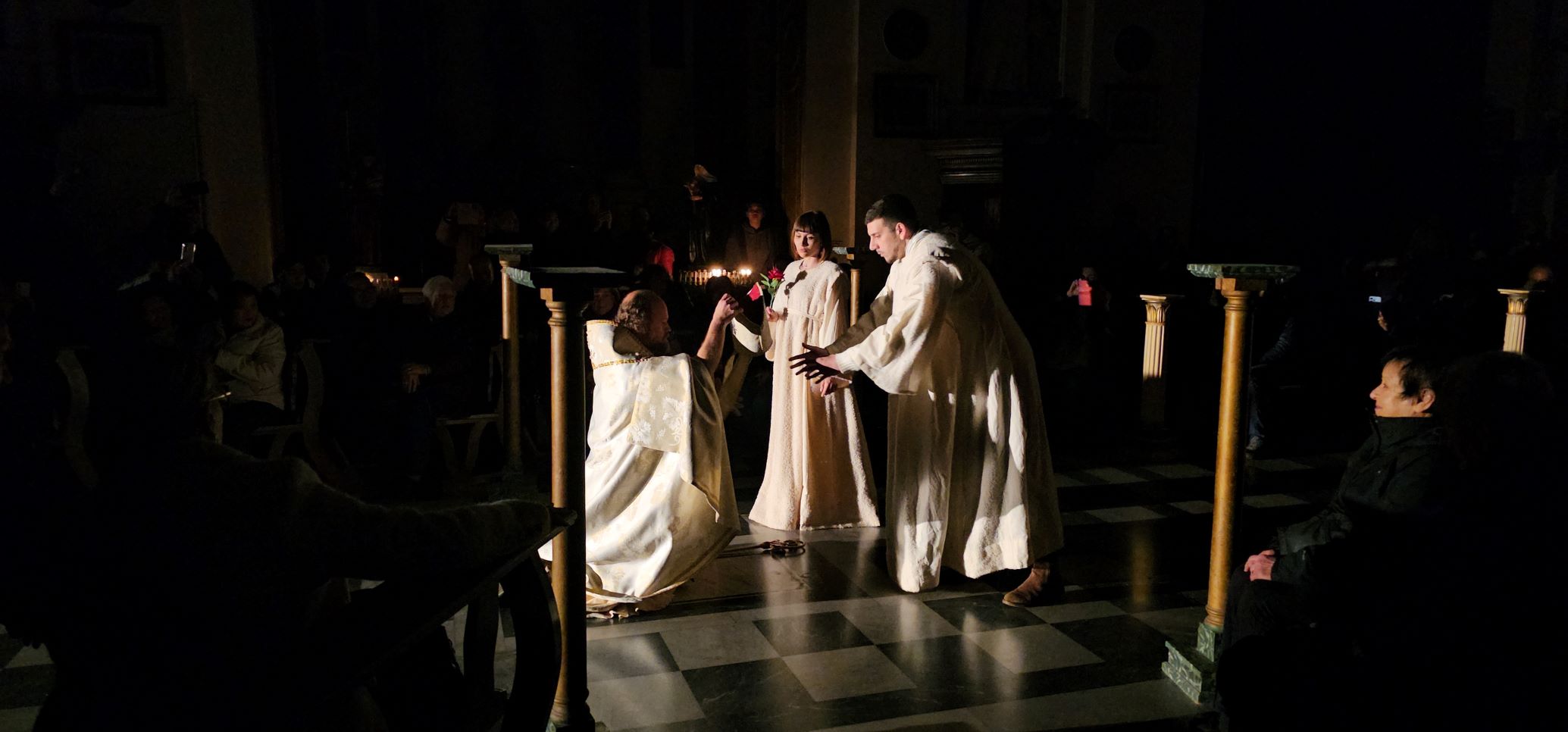 Gli interpreti recitano su di un testo liberamente tratto dall’opera “Melodrama San Valentino” composto dal ternano Antonio Checchi nel 1696, opera dedicata ai cittadini ternani e illustrissimi priori, in occasione dell’inaugurazione del nuovo altare maggiore della Basilica ove furono traslati i resti mortali del Santo, rinvenuti nel 1605.