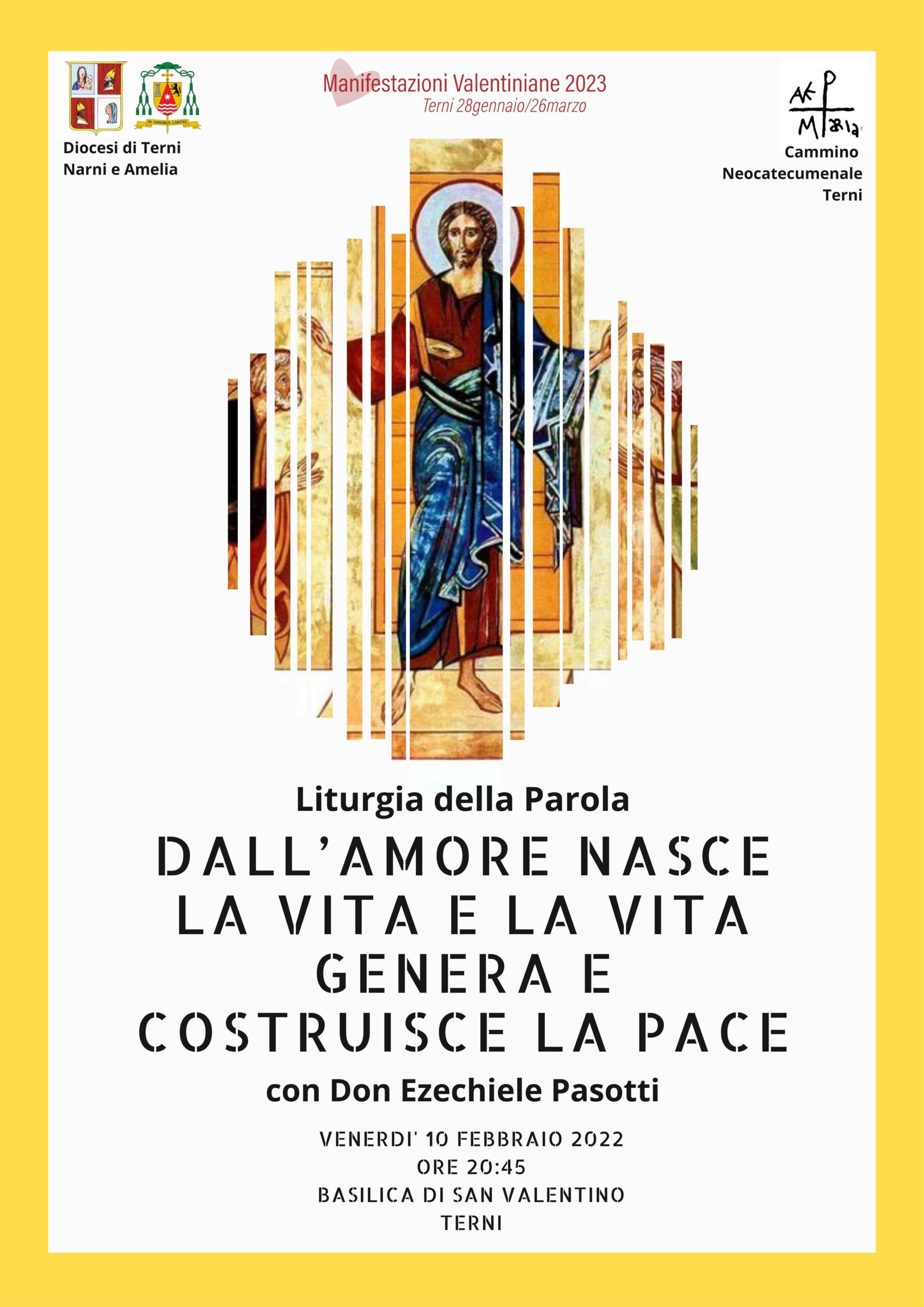 Venerdì 10 febbraio alle ore 20.45 nella basilica di San Valentino a Terni si terrà la liturgia della Parola sul tema: “Dall’amore nasce la vita e la vita genera e costruisce la pace”, guidata da don Ezechiele Pasotti (biblista e liturgista). L’incontro, promosso dal Cammino Neocatecumenale di Terni, è una delle iniziative, nell’ambito delle manifestazioni valentiniane 2023, dedicate al tema “Dall’amore, lavita, la pace”.