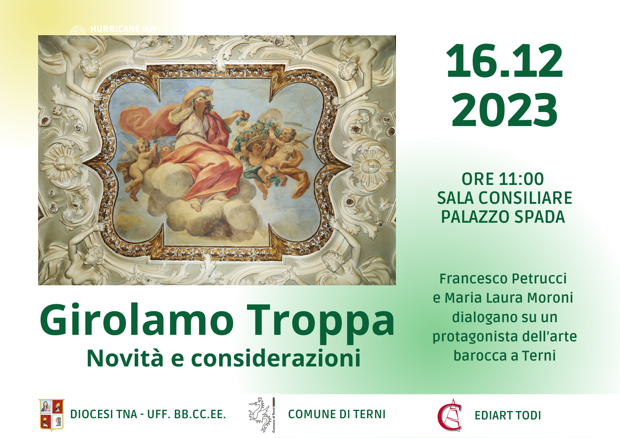 Sabato 16 dicembre alle ore 11 presso la sala consiliare di Palazzo Spada a Terni si terrà il convegno “Girolamo Troppa. Novità e considerazioni”. Dialogheranno su un protagonista dell’arte barocca a Terni Francesco Petrucci e Maria Laura Moroni.